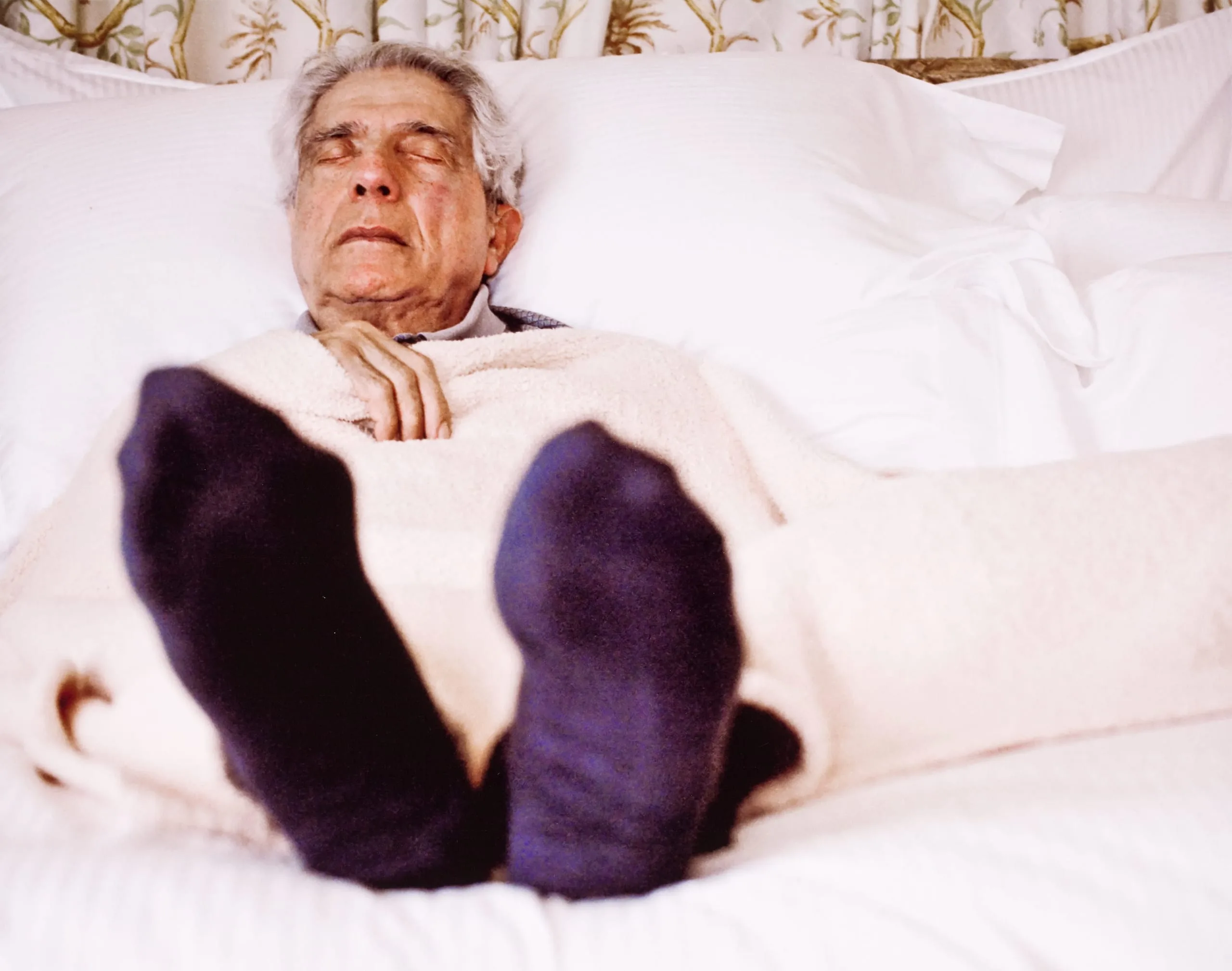 Color photograph of an older man lying in a white bed, his navy-socked feet large in the foreground, face relaxed with eyes closed against white pillows