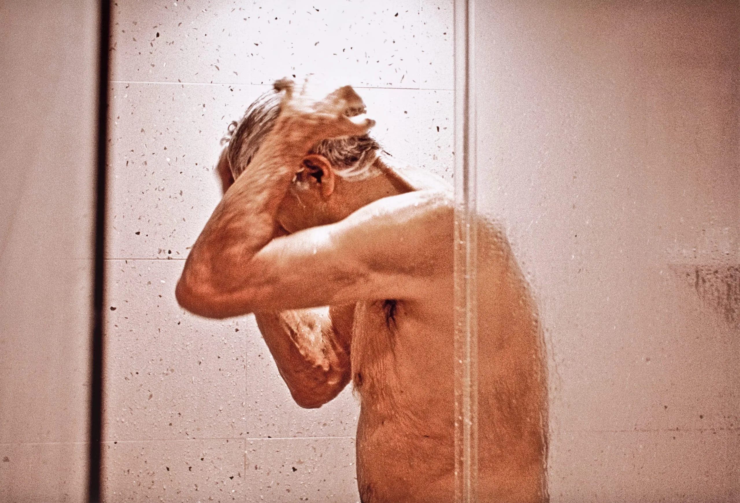 Color photograph of an elderly man showering, seen through a wet glass panel, both hands pressed to his bowed head against tiled wall