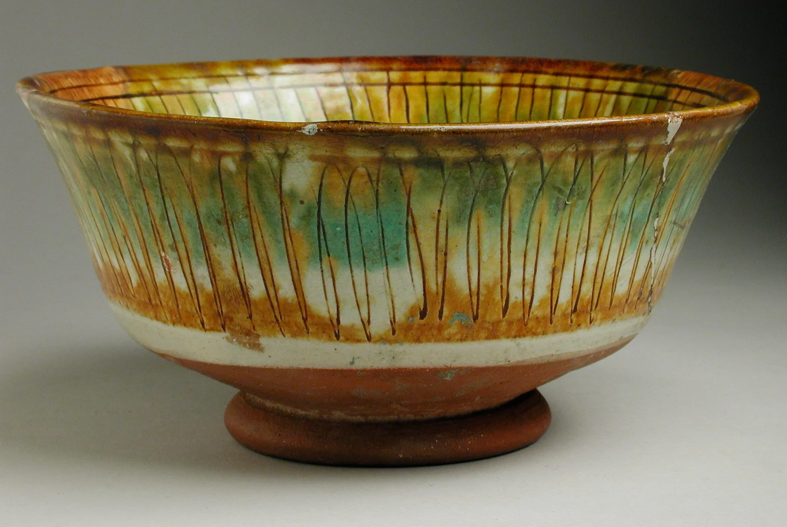Ceramic bowl with wide flared mouth and ring foot, decorated with vertical dark leaf-shaped marks over layered amber, teal, and white glazes on a red clay body