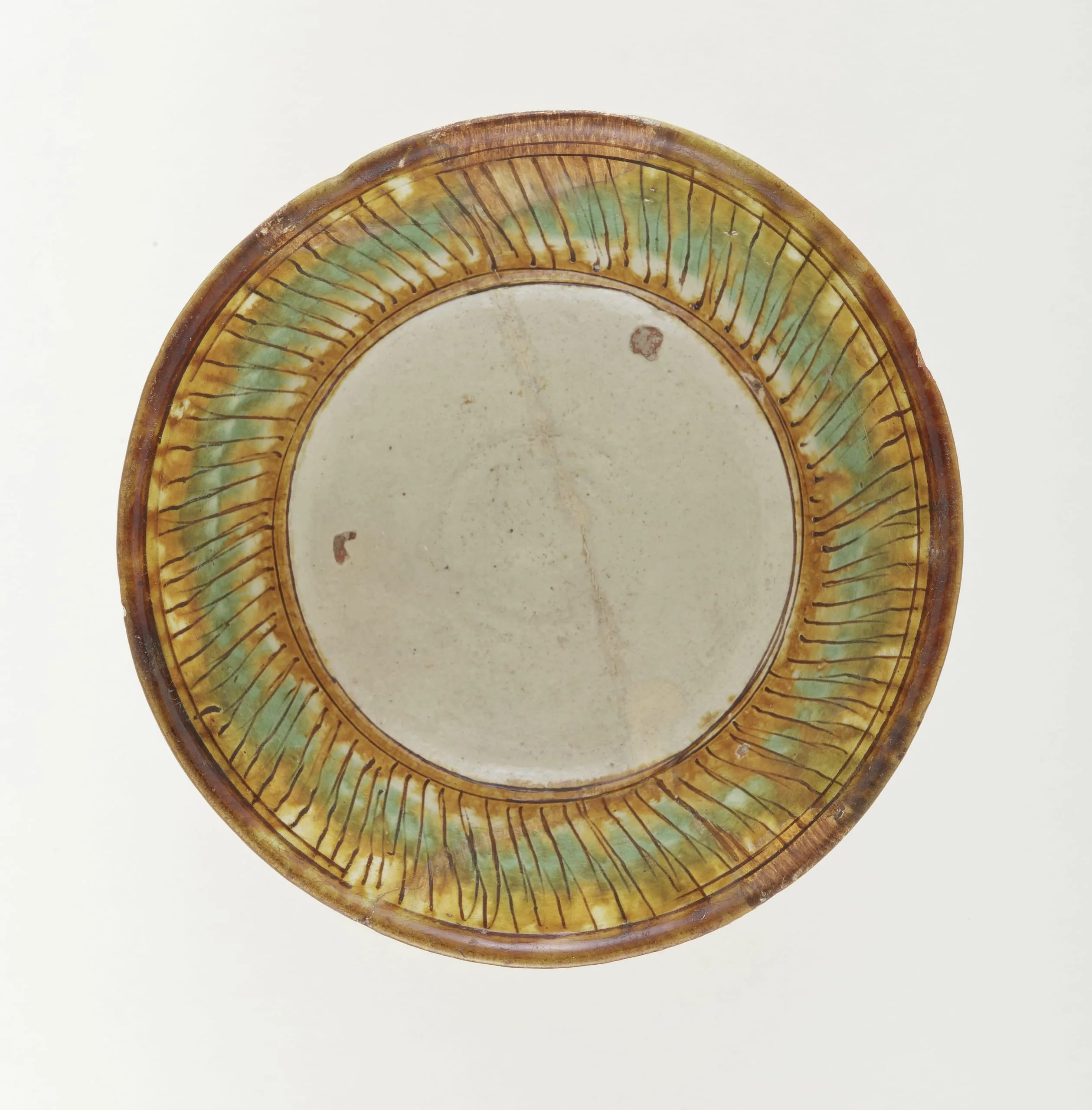 Ceramic dish viewed from above, with an unglazed white central well surrounded by a wide rim decorated with radiating incised lines under amber, green, and brown sancai-style glazes.