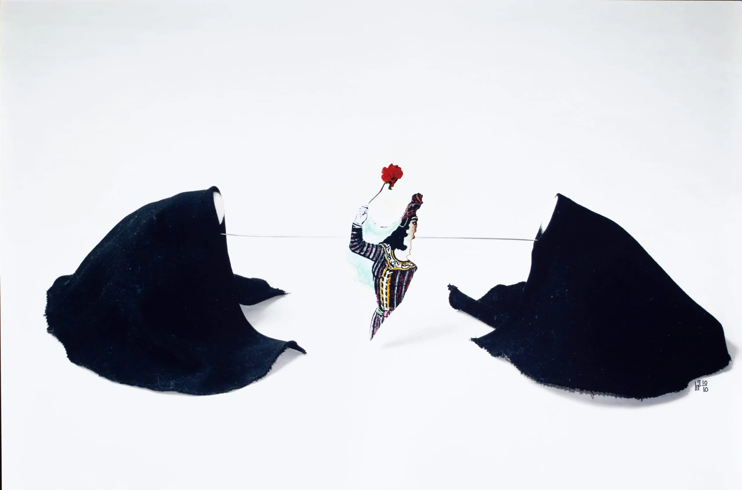In her best-selling memoir Reading Lolita in Tehran, Azar Nafisi wrote that she did not know who she was when she was wearing a veil. So too, perhaps, Houra Yaghoubi’s images of faceless, chador-draped women are intended as a metaphor for the loss of identity. Because her veiled figures are visually linked to nineteenth-century stereotypes of women, Yaghoubi’s seeming social criticism is perfectly acceptable in present-day Iran. The Persian couplets that appear in several of the prints are drawn from the Iranian national epic, the Shahnama (Book of Kings), which includes references to women as the backbone of their nations, in stark contrast to the ineffectual, doll-like figures depicted by Yaghoubi. Along with other contemporary Iranian artists, she contemplates a society caught between the present and the past.