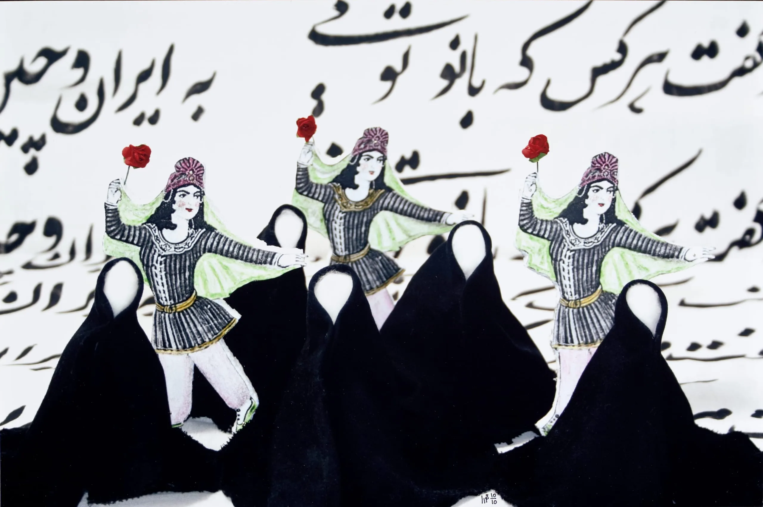 In her best-selling memoir Reading Lolita in Tehran, Azar Nafisi wrote that she did not know who she was when she was wearing a veil. So too, perhaps, Houra Yaghoubi’s images of faceless, chador-draped women are intended as a metaphor for the loss of identity. Because her veiled figures are visually linked to nineteenth-century stereotypes of women, Yaghoubi’s seeming social criticism is perfectly acceptable in present-day Iran. The Persian couplets that appear in several of the prints are drawn from the Iranian national epic, the Shahnama (Book of Kings), which includes references to women as the backbone of their nations, in stark contrast to the ineffectual, doll-like figures depicted by Yaghoubi. Along with other contemporary Iranian artists, she contemplates a society caught between the present and the past.