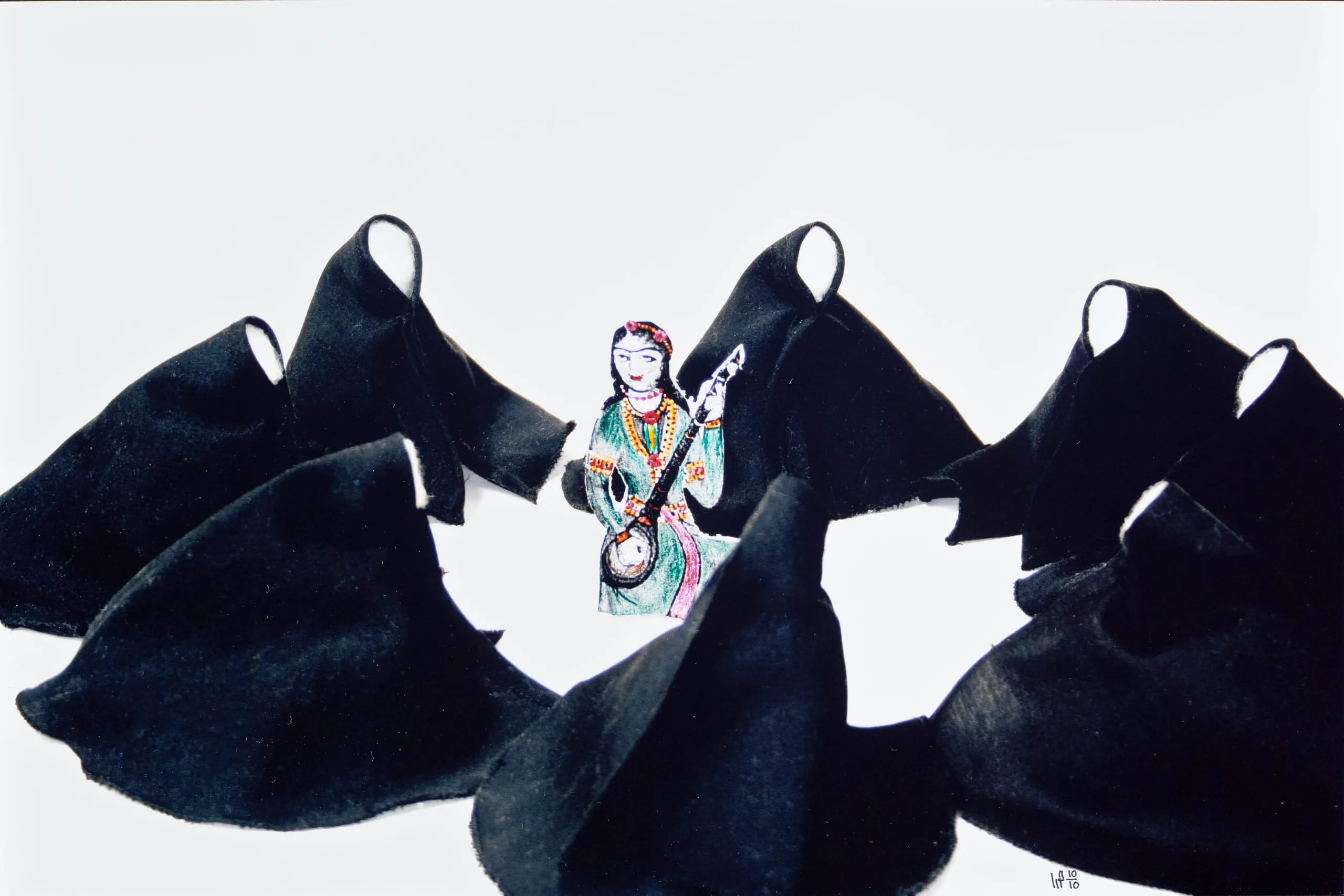 In her best-selling memoir Reading Lolita in Tehran, Azar Nafisi wrote that she did not know who she was when she was wearing a veil. So too, perhaps, Houra Yaghoubi’s images of faceless, chador-draped women are intended as a metaphor for the loss of identity. Because her veiled figures are visually linked to nineteenth-century stereotypes of women, Yaghoubi’s seeming social criticism is perfectly acceptable in present-day Iran. The Persian couplets that appear in several of the prints are drawn from the Iranian national epic, the Shahnama (Book of Kings), which includes references to women as the backbone of their nations, in stark contrast to the ineffectual, doll-like figures depicted by Yaghoubi. Along with other contemporary Iranian artists, she contemplates a society caught between the present and the past.