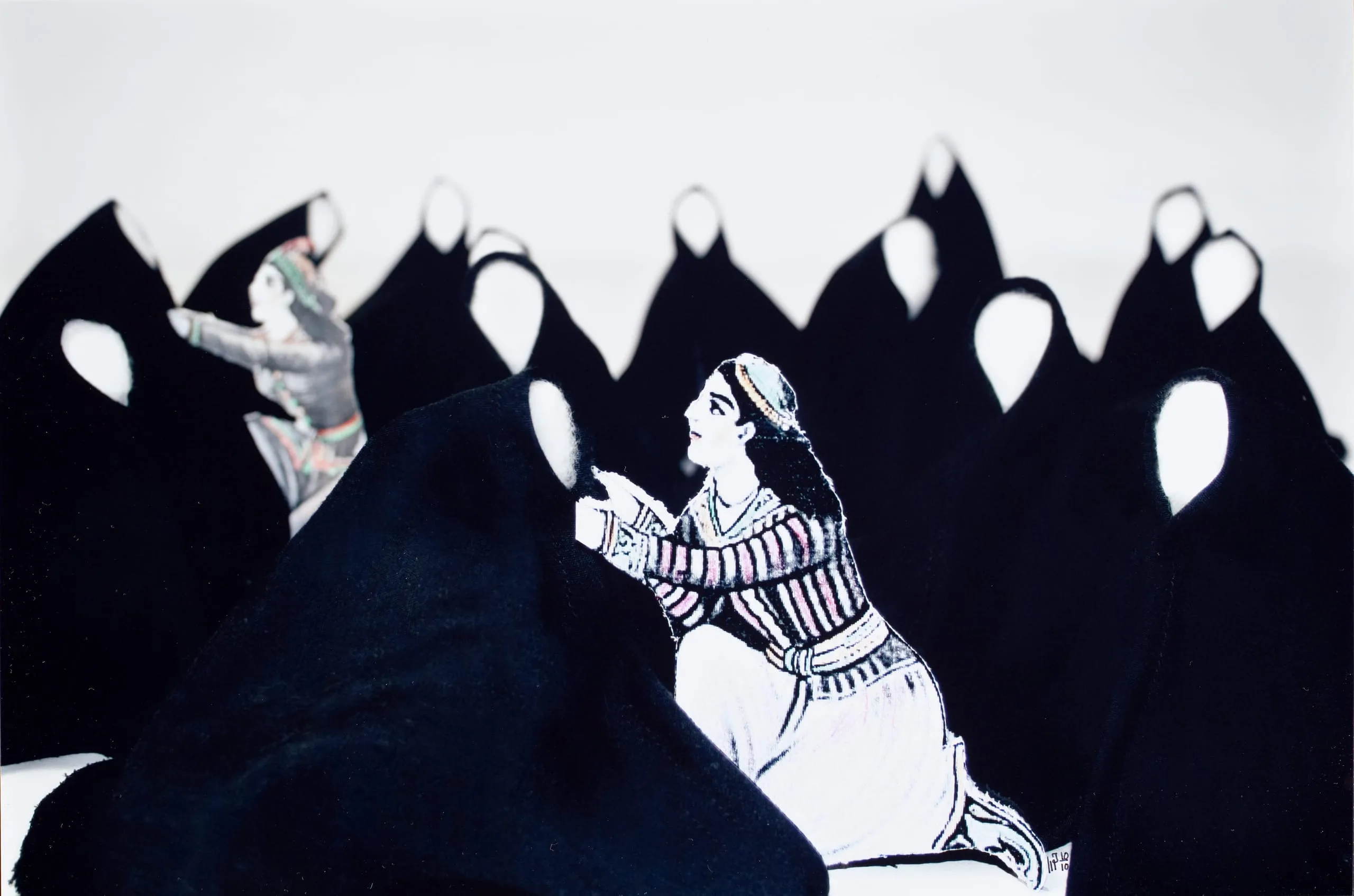 In her best-selling memoir Reading Lolita in Tehran, Azar Nafisi wrote that she did not know who she was when she was wearing a veil. So too, perhaps, Houra Yaghoubi’s images of faceless, chador-draped women are intended as a metaphor for the loss of identity. Because her veiled figures are visually linked to nineteenth-century stereotypes of women, Yaghoubi’s seeming social criticism is perfectly acceptable in present-day Iran. The Persian couplets that appear in several of the prints are drawn from the Iranian national epic, the Shahnama (Book of Kings), which includes references to women as the backbone of their nations, in stark contrast to the ineffectual, doll-like figures depicted by Yaghoubi. Along with other contemporary Iranian artists, she contemplates a society caught between the present and the past.