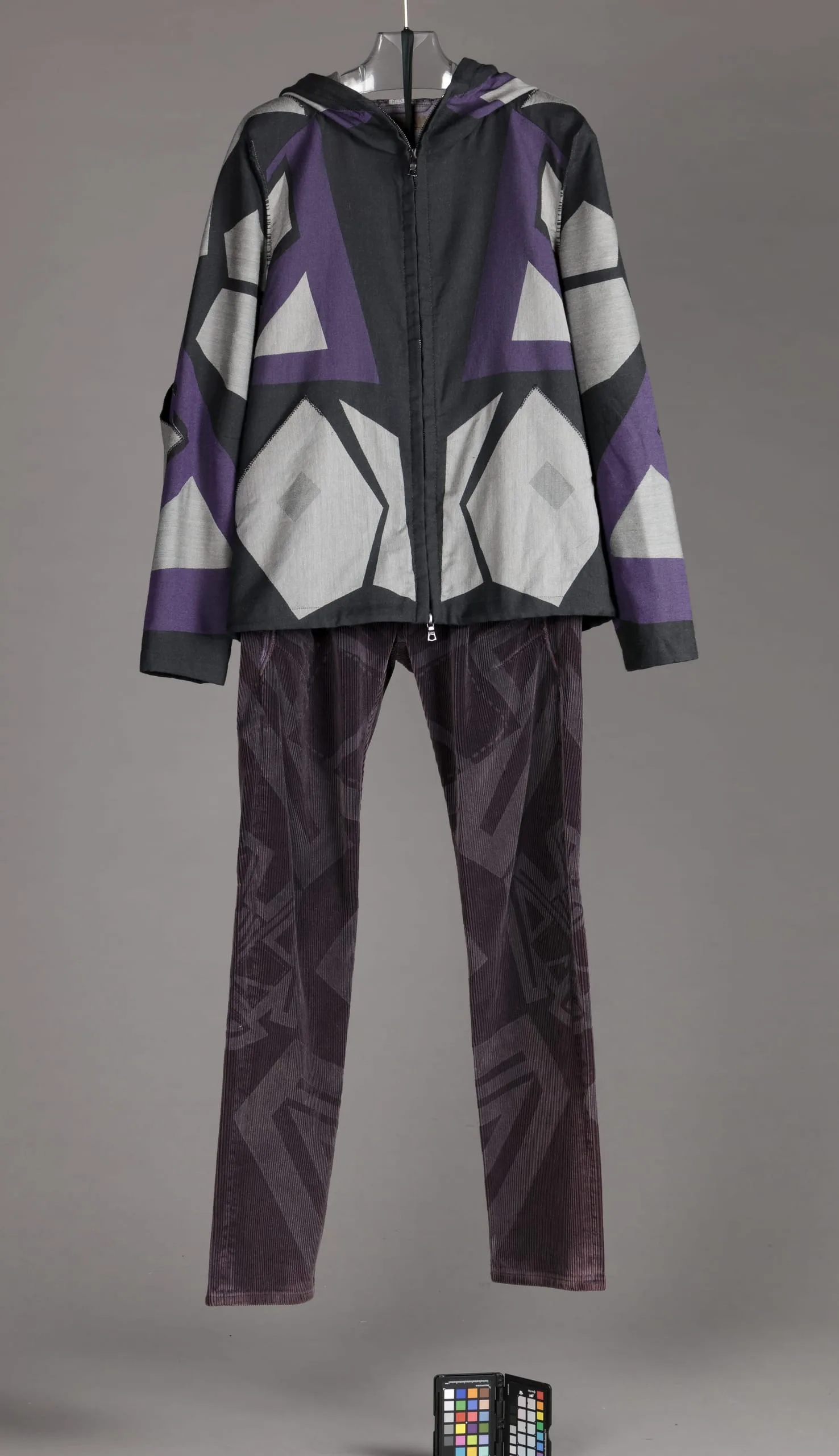 - Jacket: wool/polyester twill double cloth, printed. Pants: cotton velvet (corduroy), cotton plain weave (canvas), printed