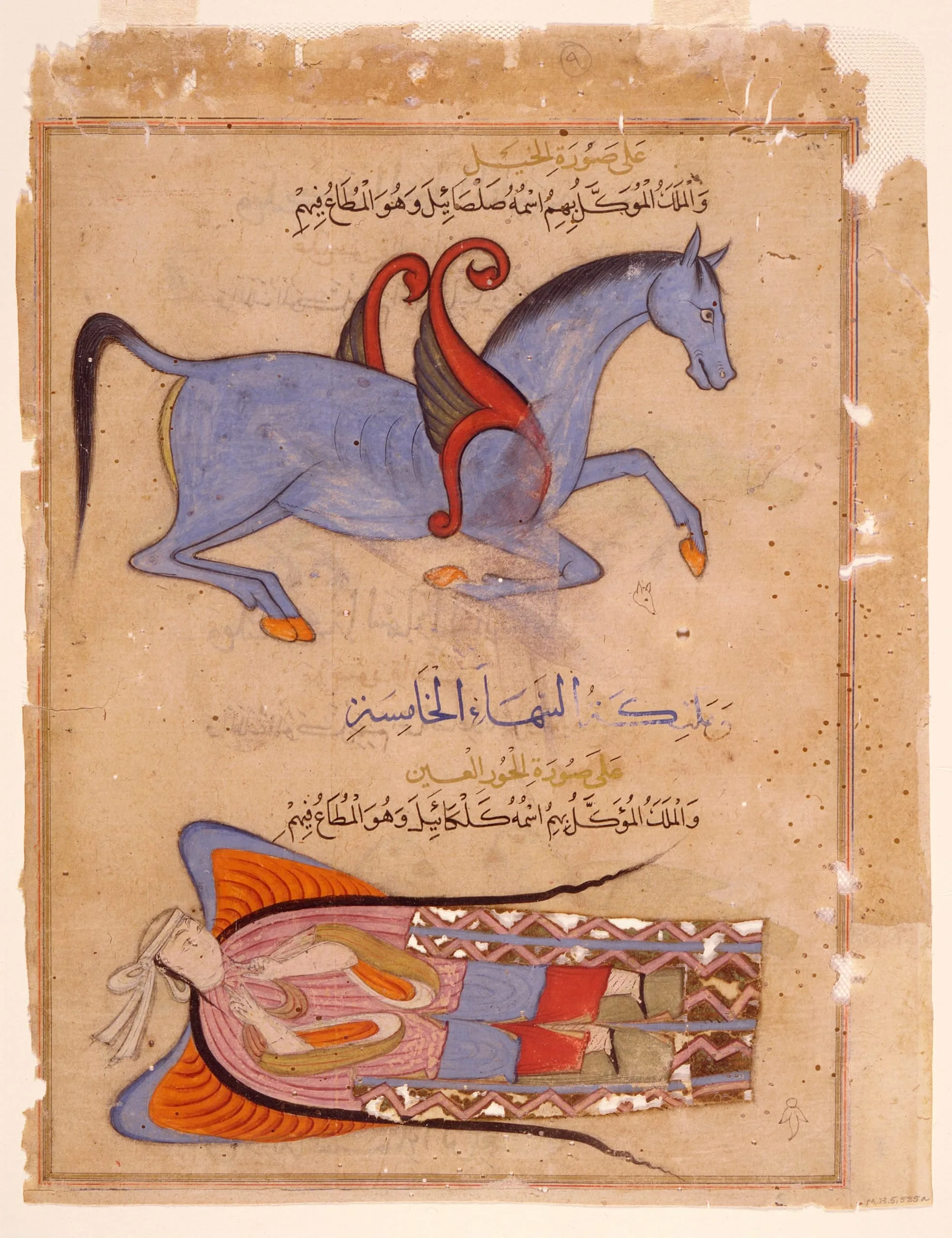 Recto: A Winged Horse (salsail) and a supine Angel or peri (hur) representing the angels of the fourth and fifth heavens led by Sasail and Kalkail respectively.