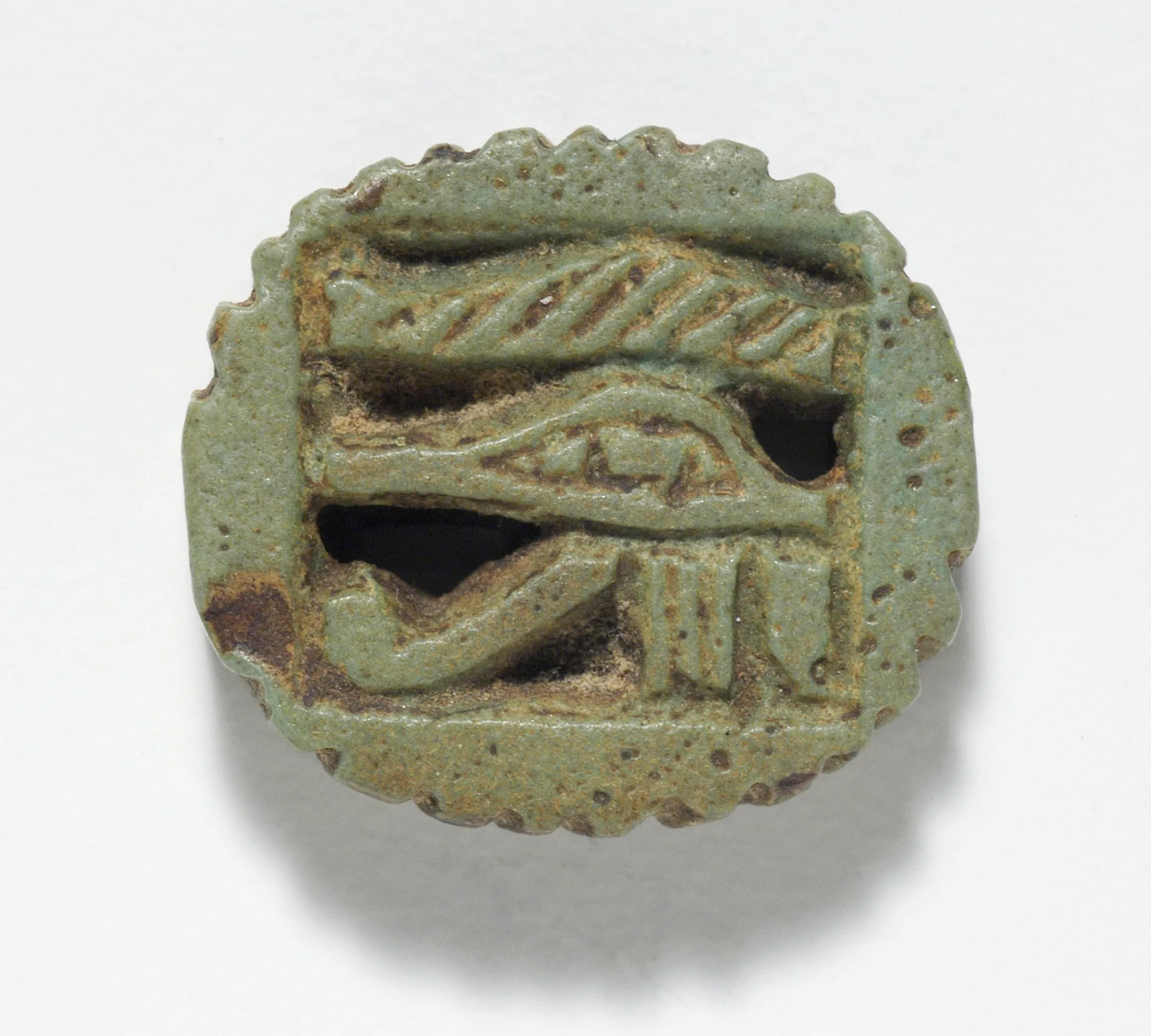Small oval faience object with scalloped border and carved Egyptian hieroglyphs in low relief, including an Eye of Horus, in worn sage-green glaze