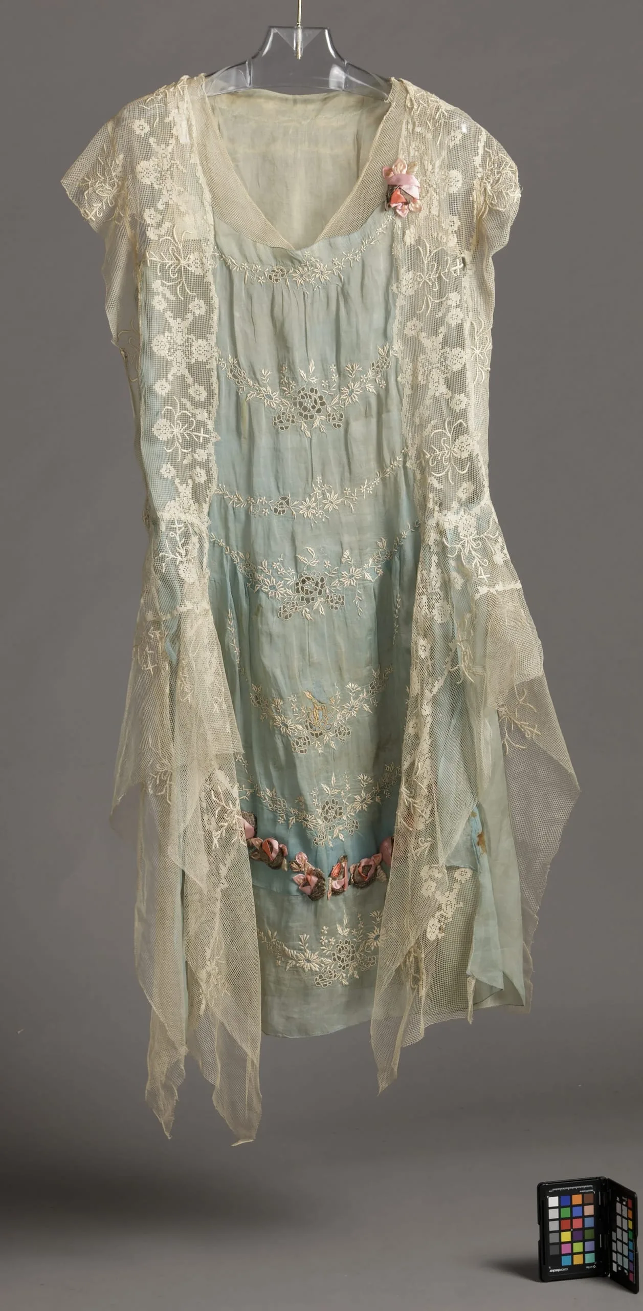 - Piňa plain weave with cotton cutwork and drawnwork embroidery with linen lace and silk plain and metallic-thread plain weave rosettes