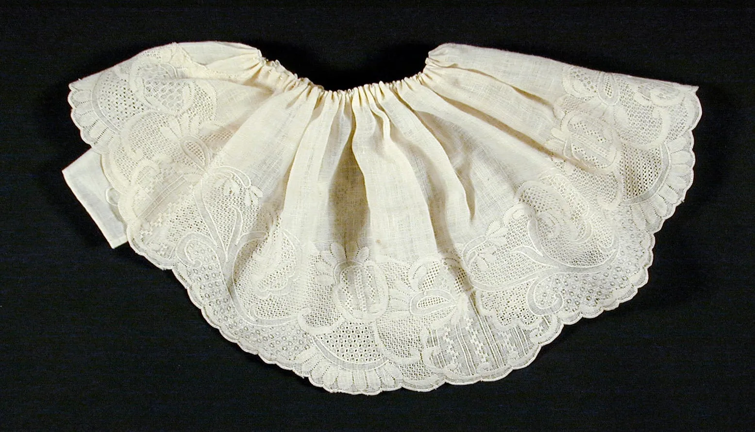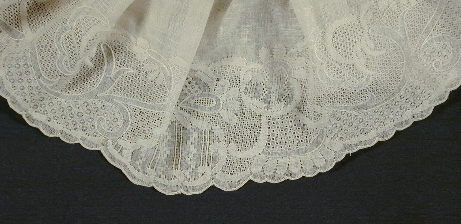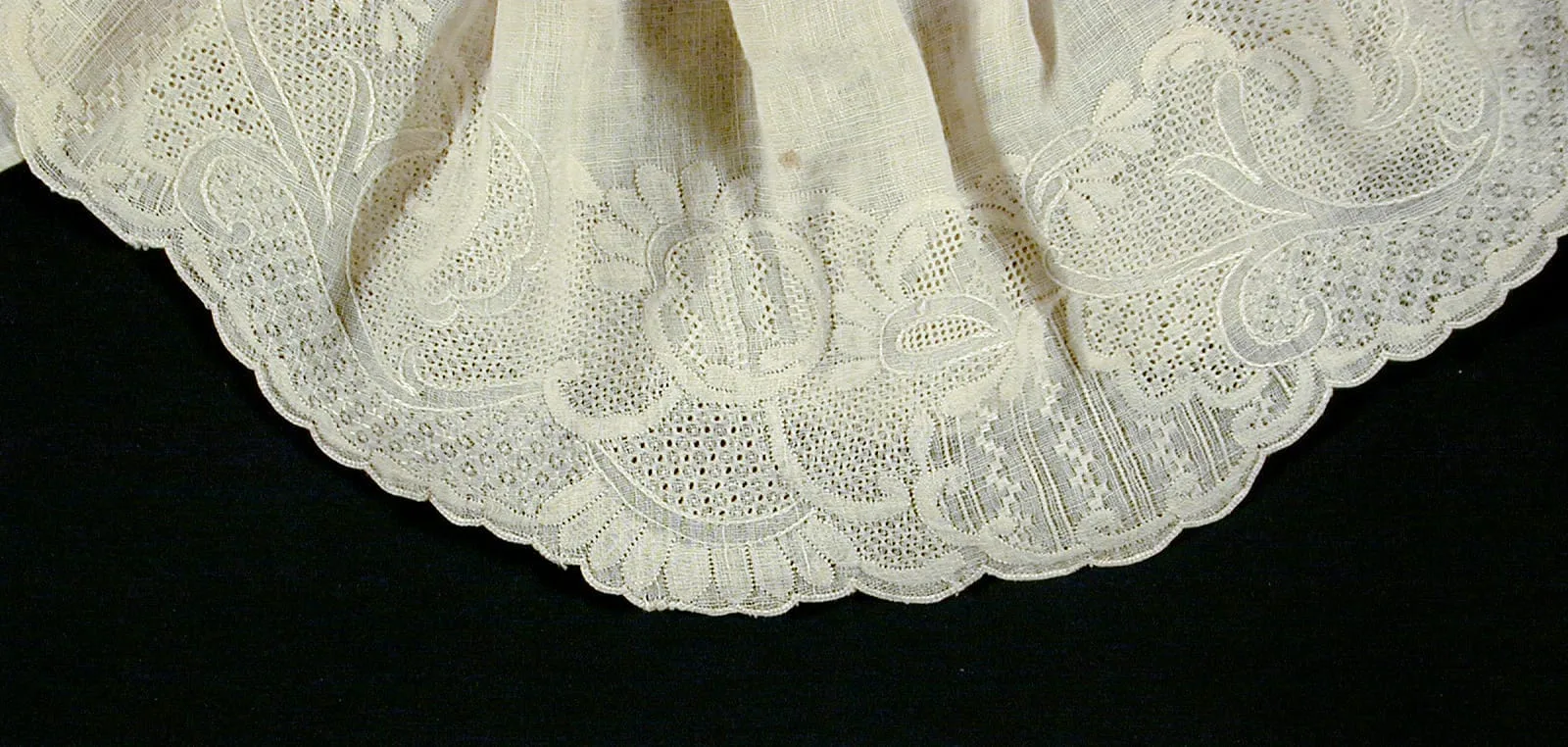 - Single sleeve ruffles of white cotton Dresden work on white linen