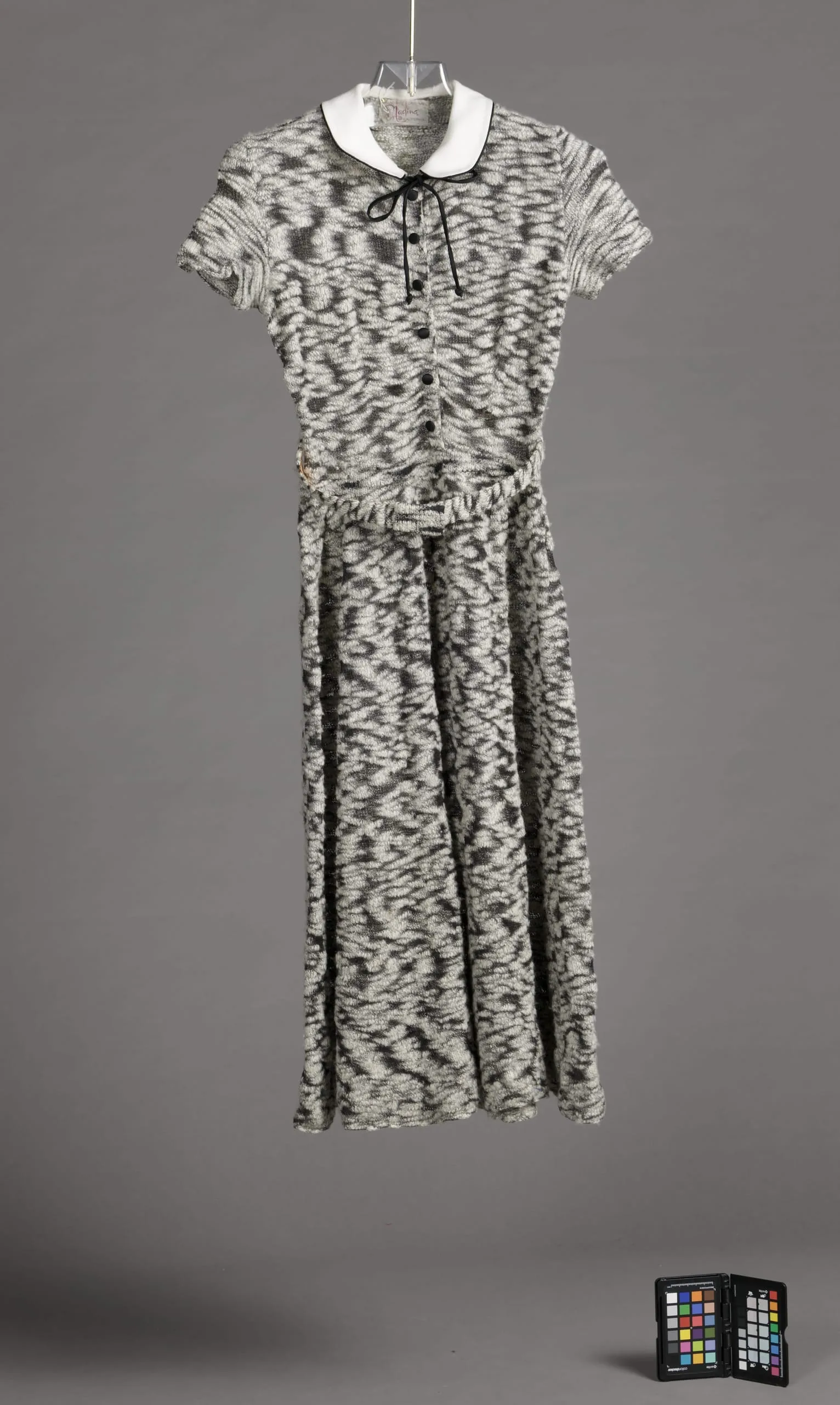 - Dress: Wool knit with linen plain weave and silk satin