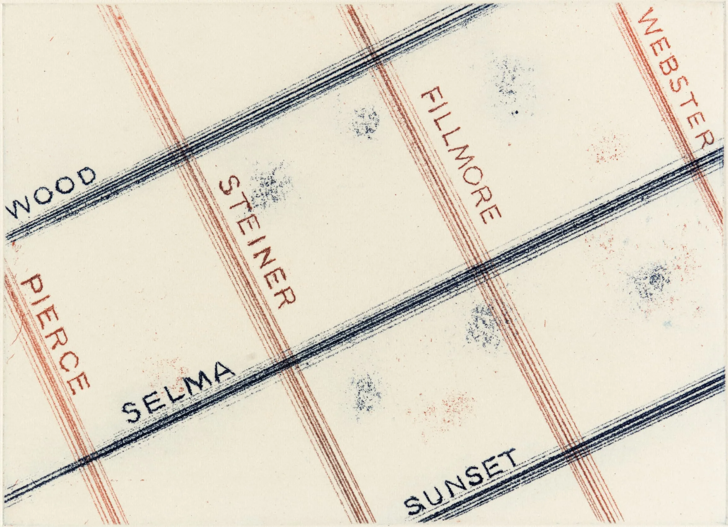 Horizontal print on cream paper showing a diagonal street grid with navy and red ink lines labeled with street names including WOOD, STEINER, FILLMORE, SELMA, and SUNSET