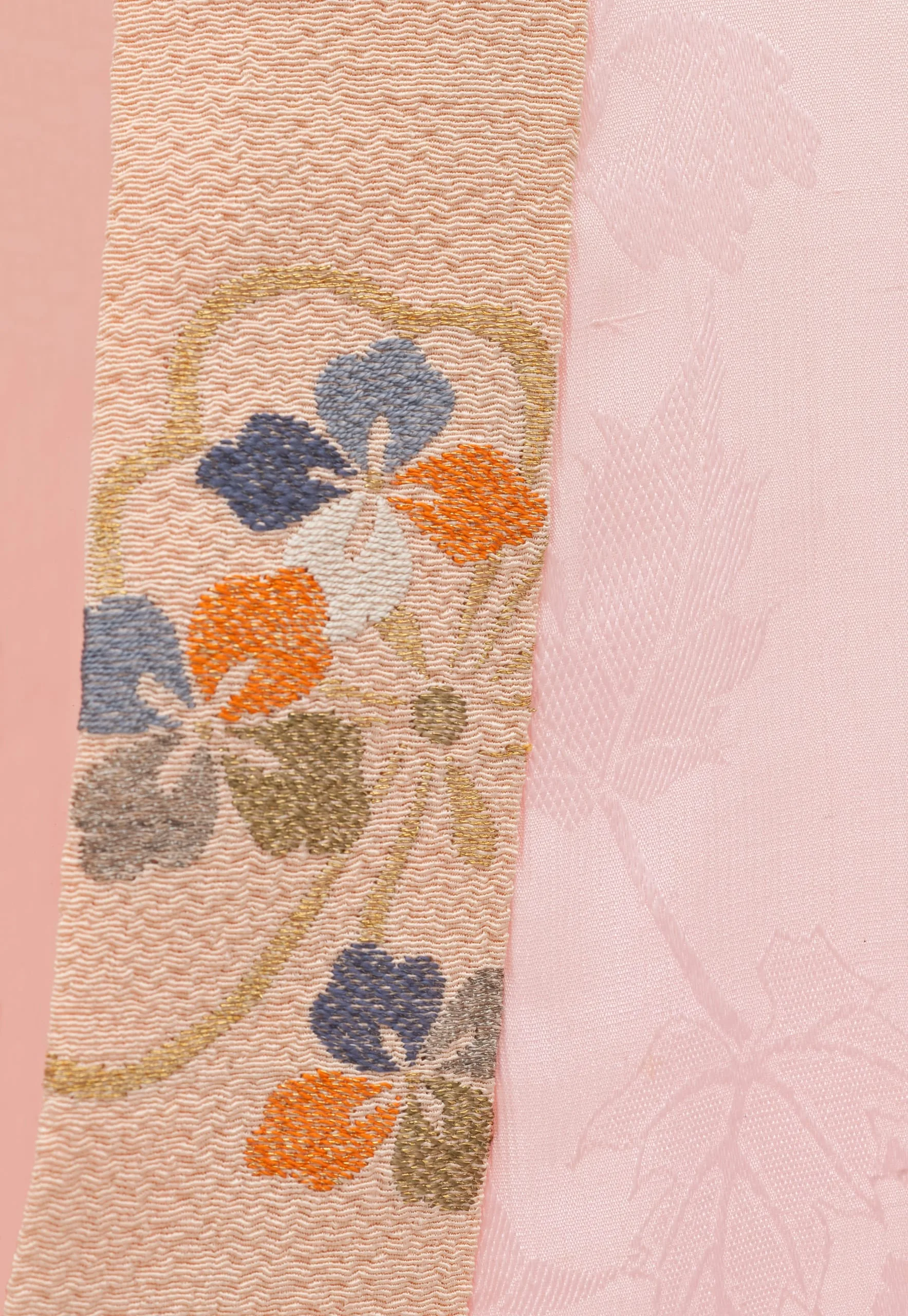 Obi: Silk twill with silk and metallic-thread supplementary weft patterning bound in plain weave (lampas)