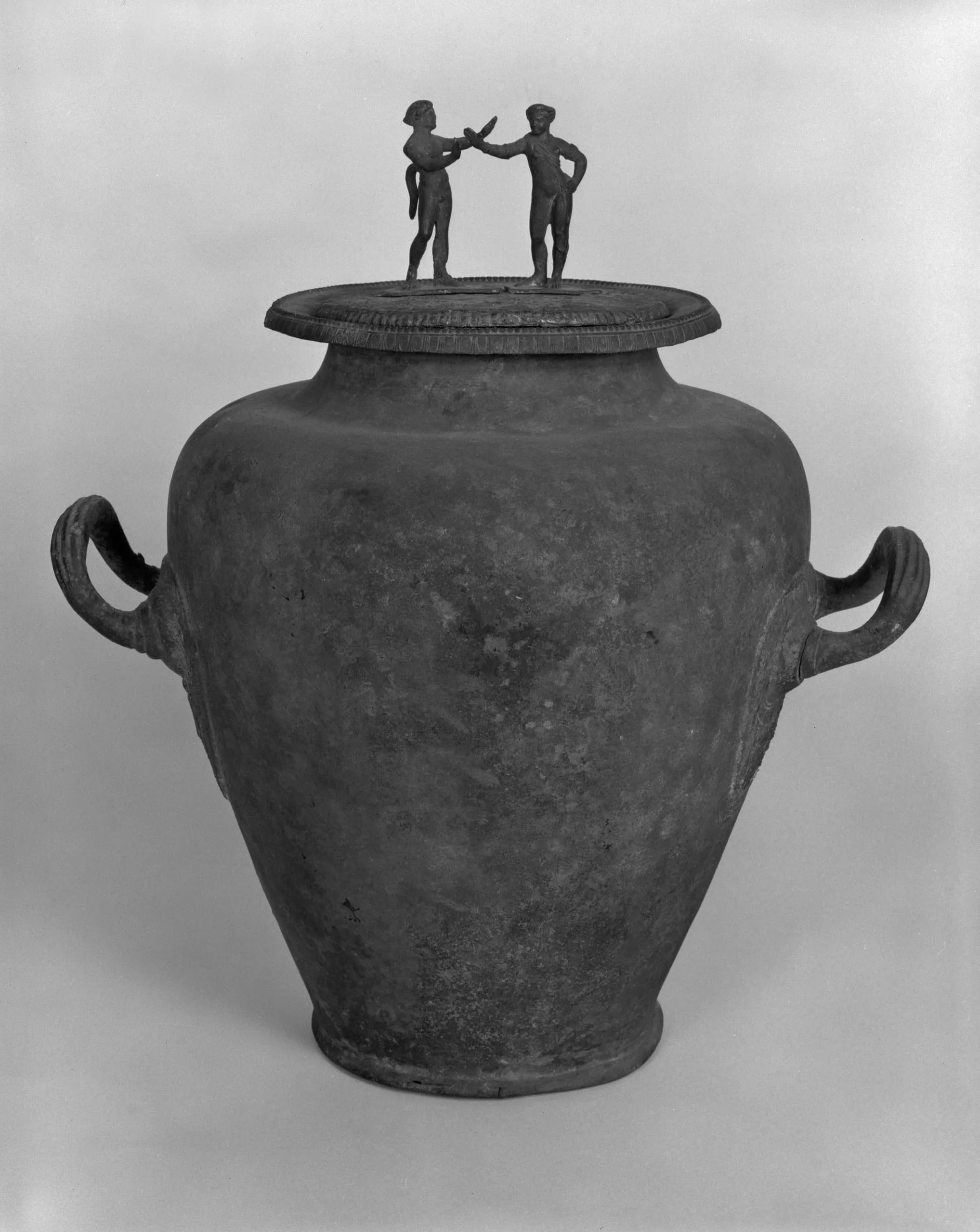 - Stamnos and Lid (Mirror) with a Handle in the Form of a Satyr and a Maenad