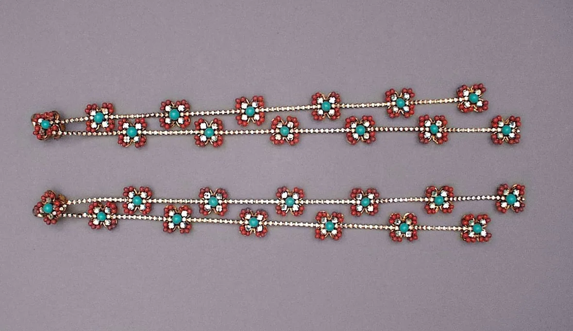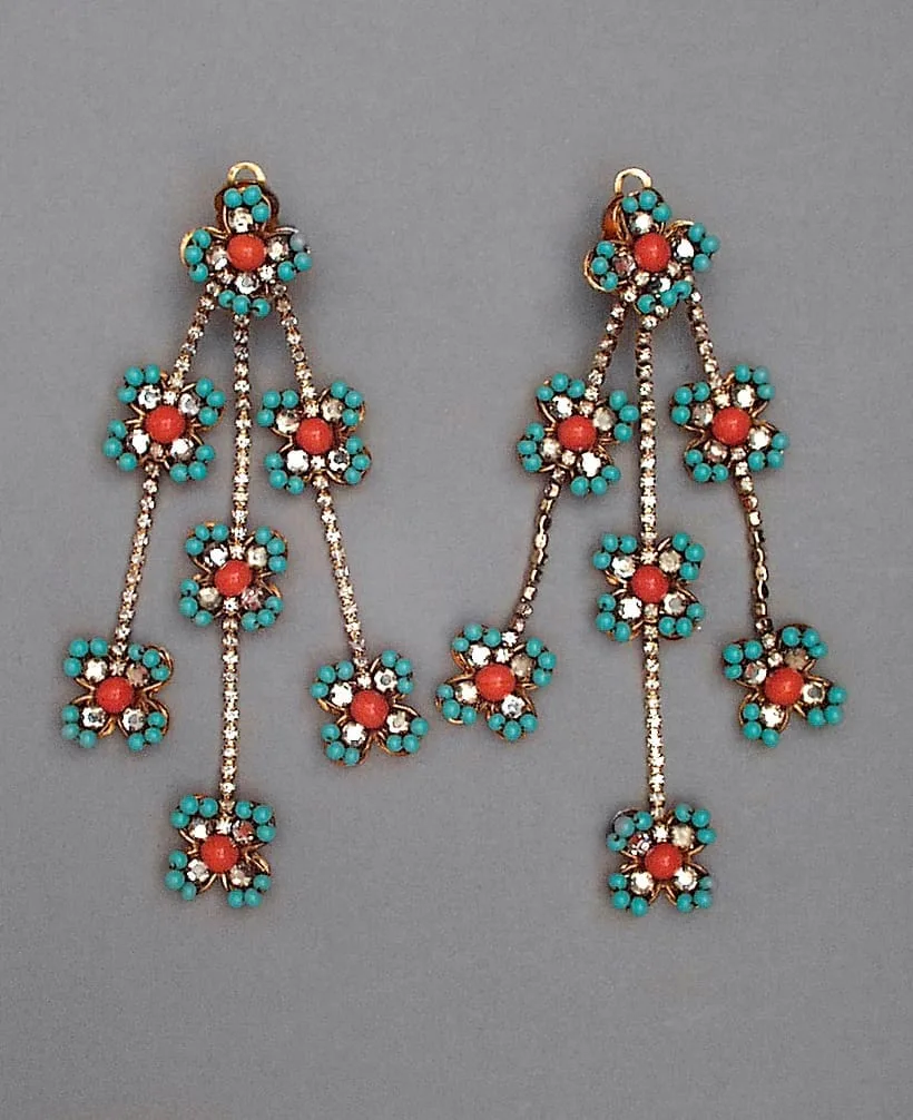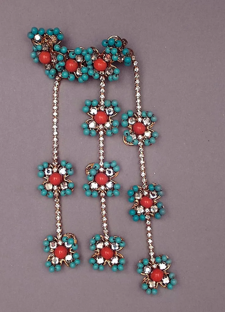 - Glass faux coral and turquoise; crystal montees, 18 kt gold-electroplated brass; faux diamond chain