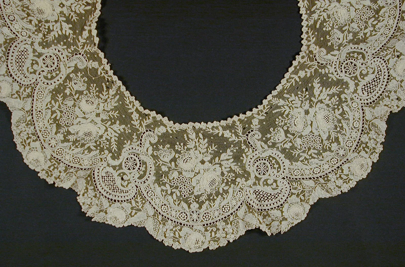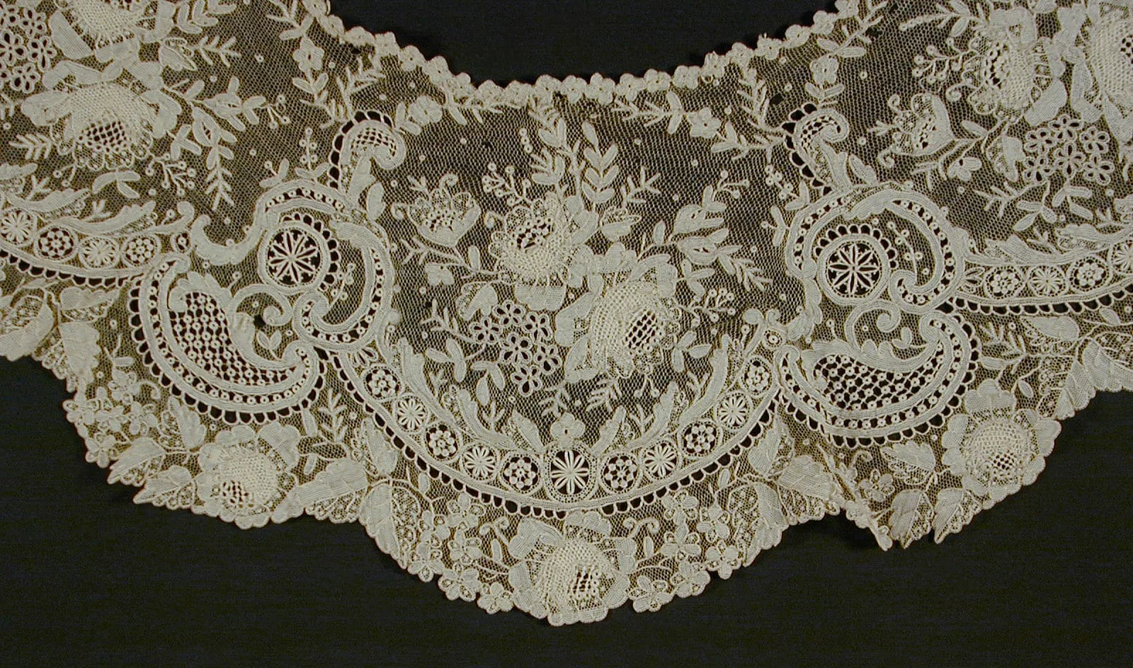 Cream-colored lace collar spread flat, featuring a dense allover pattern of scrolling motifs, flowering branches, birds, and scalloped lower border on a fine net ground
