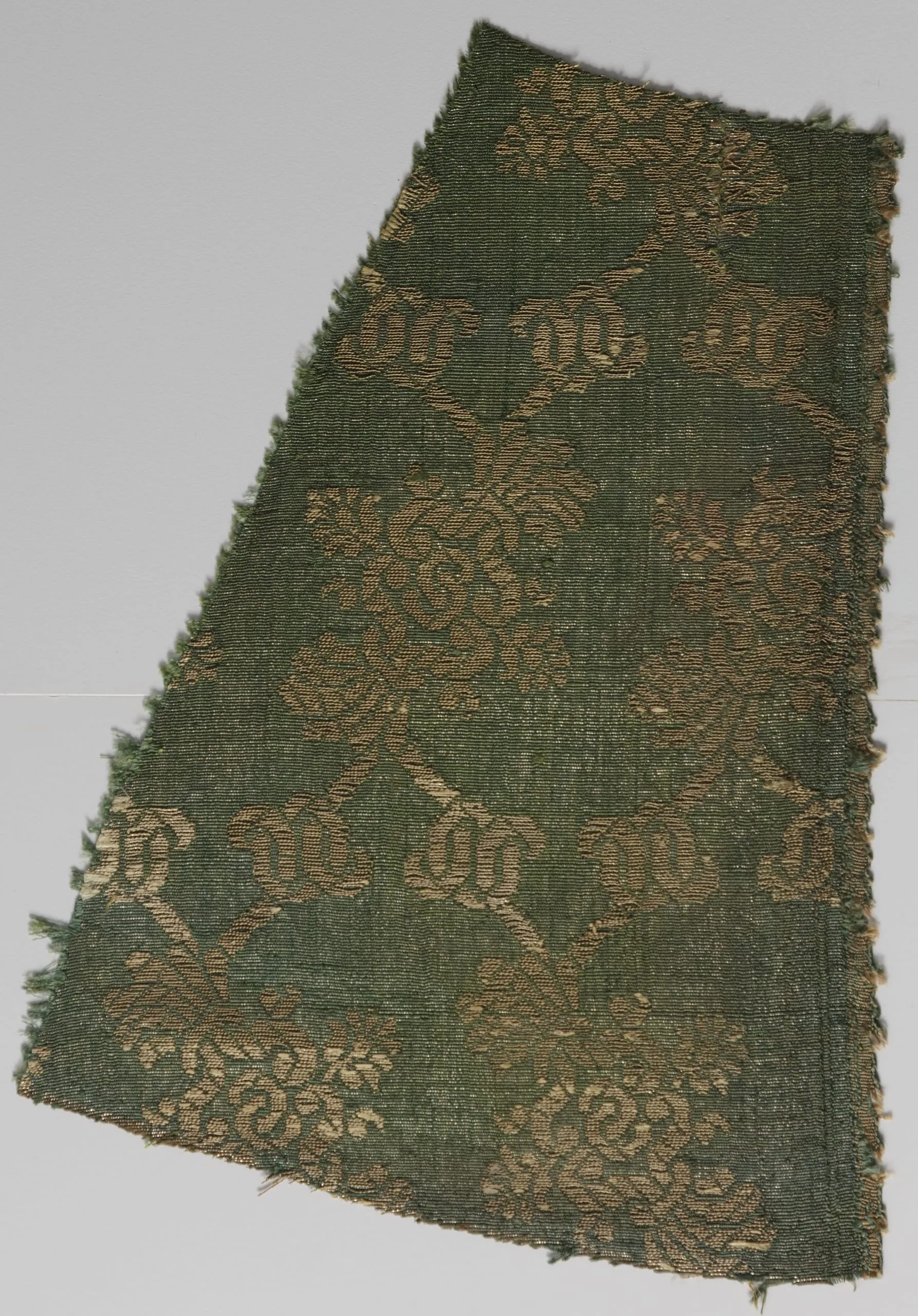 - Silk plain weave (faille) with metal-strip supplementary-weft patterning and metallic-thread discontinuous supplementary-weft patterning (brocade)