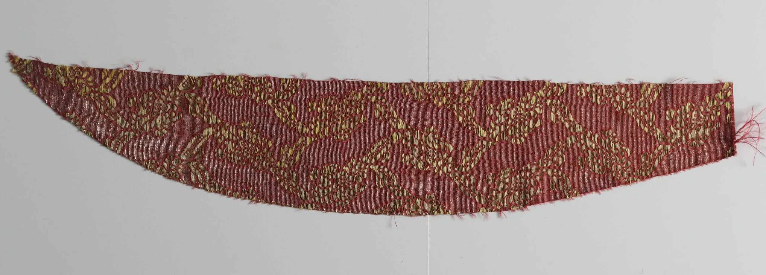 Crescent-shaped textile fragment with crimson-red ground woven with an allover gold metallic ogival lattice and foliate motifs, edges frayed