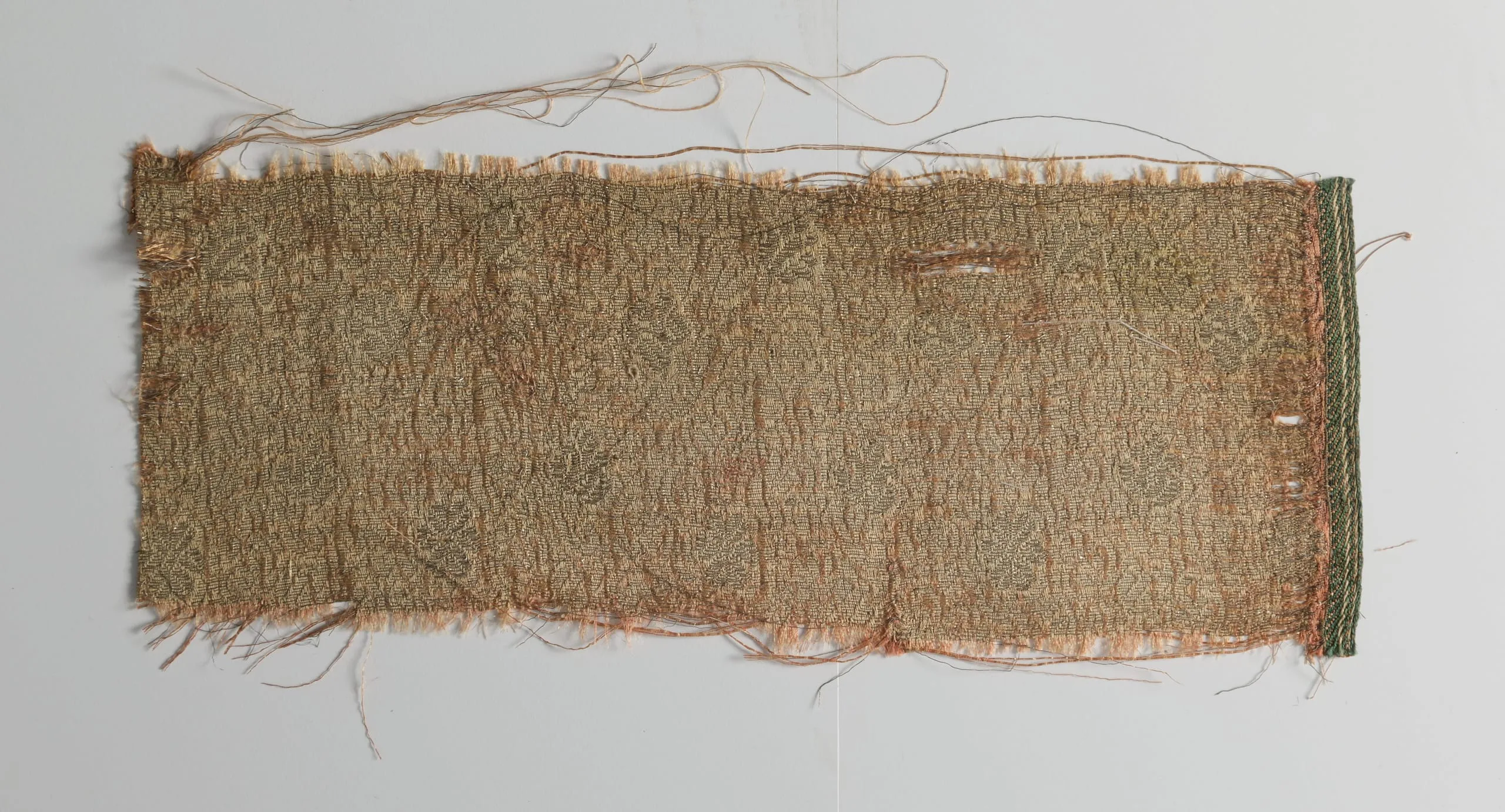 Textile fragment with allover gold and olive-green metallic weave in a curling leaf pattern, heavily frayed on three edges with a narrow green-and-ivory woven border along the right edge