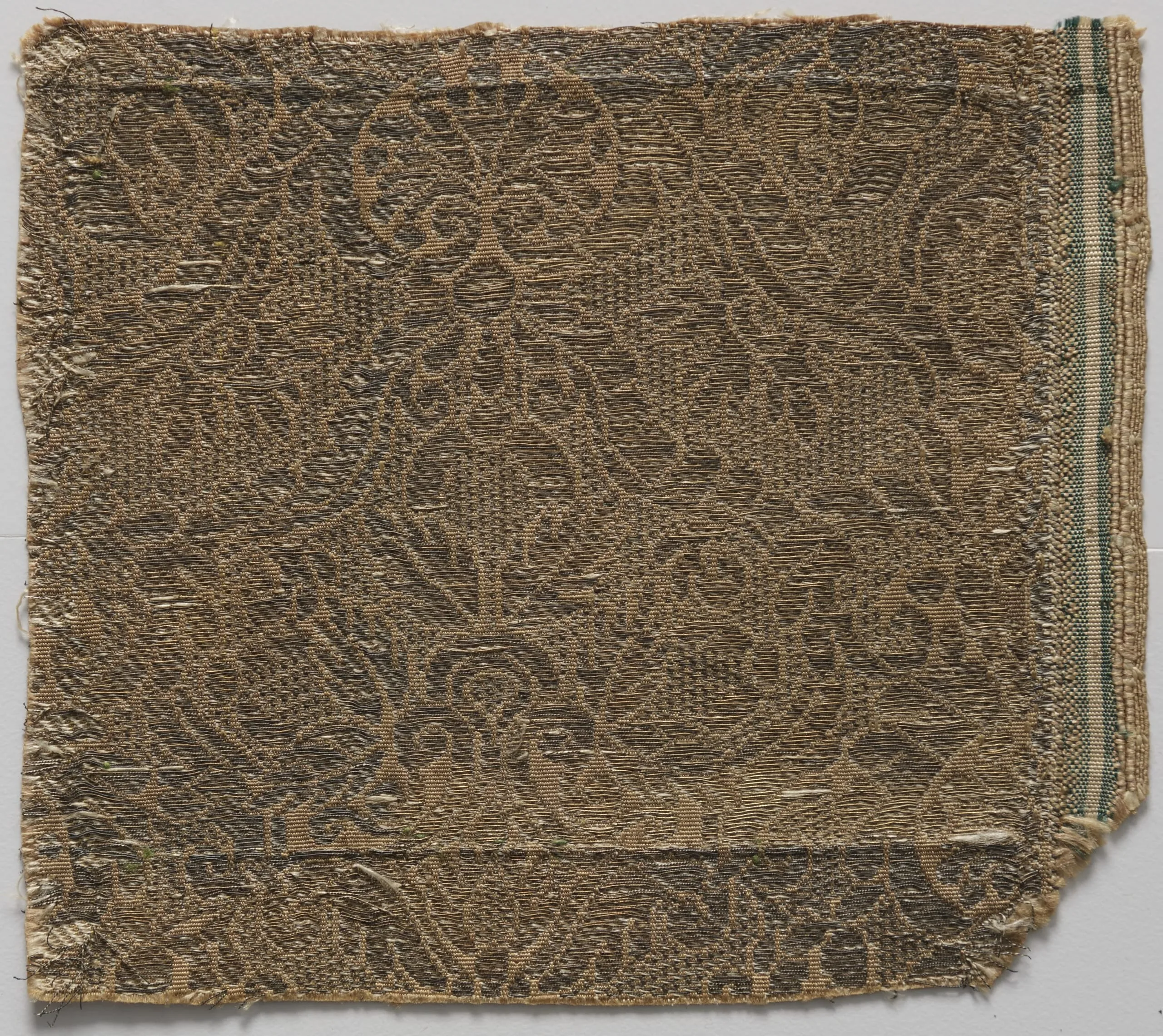 - Silk plain weave with metallic-thread supplementary-weft patterning bound in twill (lampas)