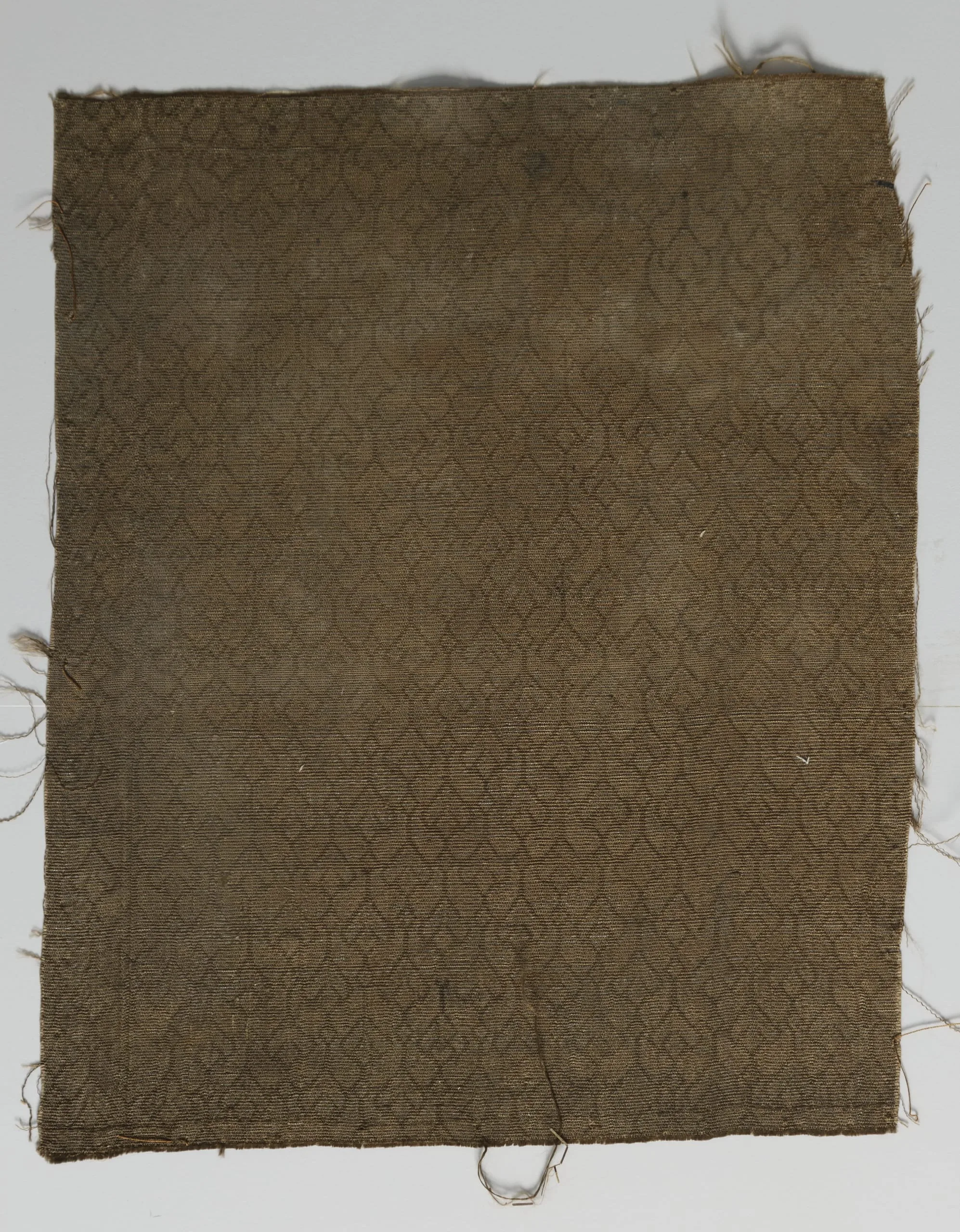 Rectangular woven textile fragment in olive-brown tones with an allover tone-on-tone ogival lattice pattern and frayed edges on all sides