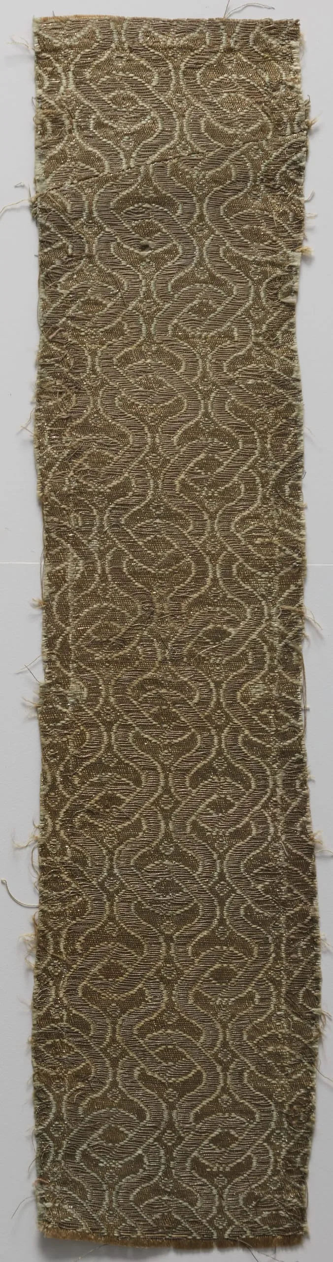 Narrow vertical textile fragment with allover woven pattern of interlocking S-curves and ogival shapes in olive brown and dull gold metallic threads, with frayed edges