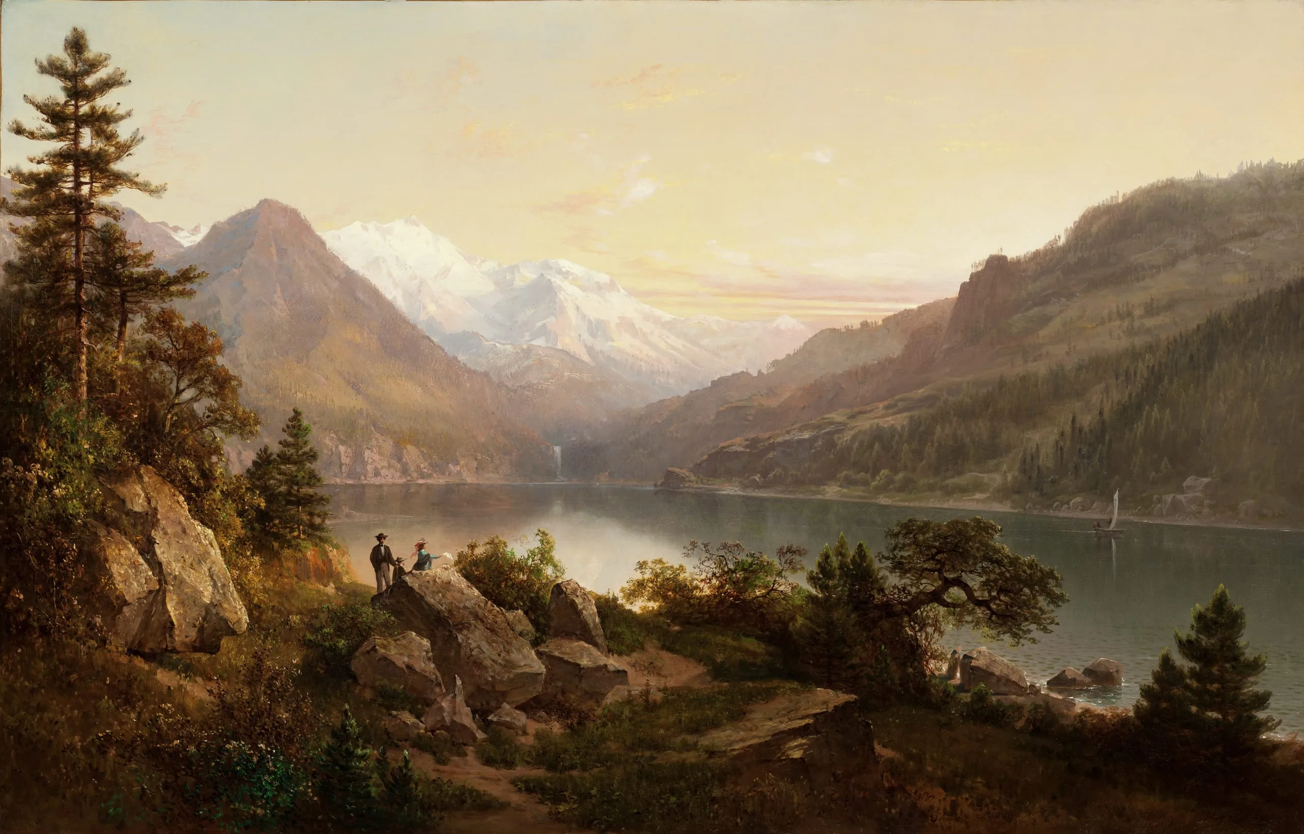 Thomas Hill is so firmly identified with views of Yosemite that this painting was long thought to depict a lake in Yosemite even though no lake of this size is to be found there. The liberties that Hill took with topography make it difficult to identify conclusively the sites of a number of his paintings, but the distinctive double-peaked hill at the left, known as Maggies Peaks, mark this painting as a view of Lake Tahoe, and the waterfall suggests Emerald Bay. The Daily Alta California of June 19, 1864, in the year the museum’s landscape was painted, mentioned that Hill exhibited a view of Emerald Bay of about the same size and also showing Maggies Peaks and the same sunset effect: ‘A beautiful bit of Emerald Bay, Lake Tahoe by T. Hill, was placed in the window of Jones, Woll [sic] and Sutherland. It is about 3’ x 4’, a sunset; the twin buttes (Maggies Peaks, at left) and snowy mountains in the distance are lit by the red rays of evening. The light and shade are forcible . . . ." By the mid-1860s, tourists, such as those depicted in this painting, were visiting Emerald Bay.