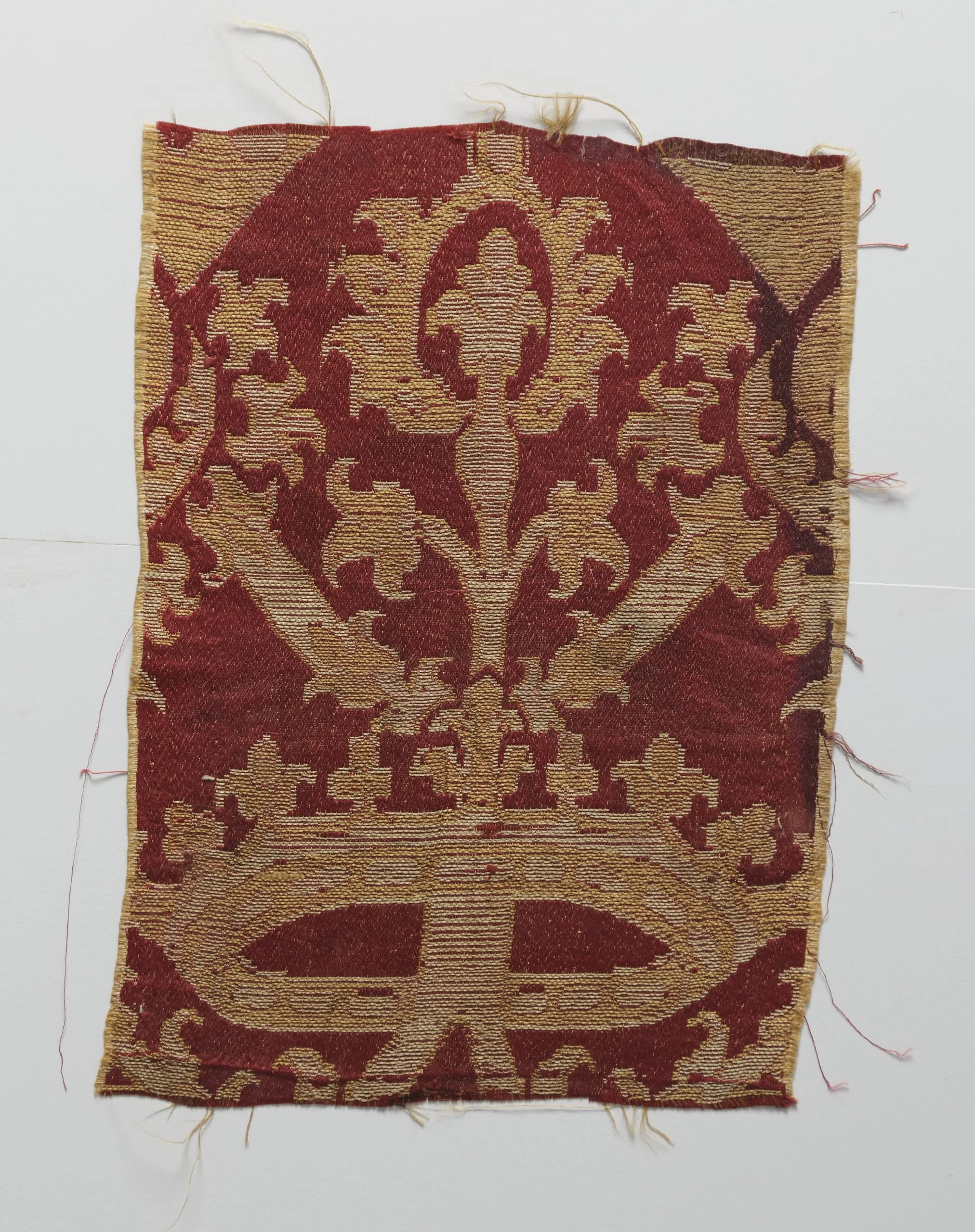 - Silk plain weave (faille) with metal-strip supplementary-weft patterning and metallic-thread discontinuous supplementary-weft patterning (brocade)