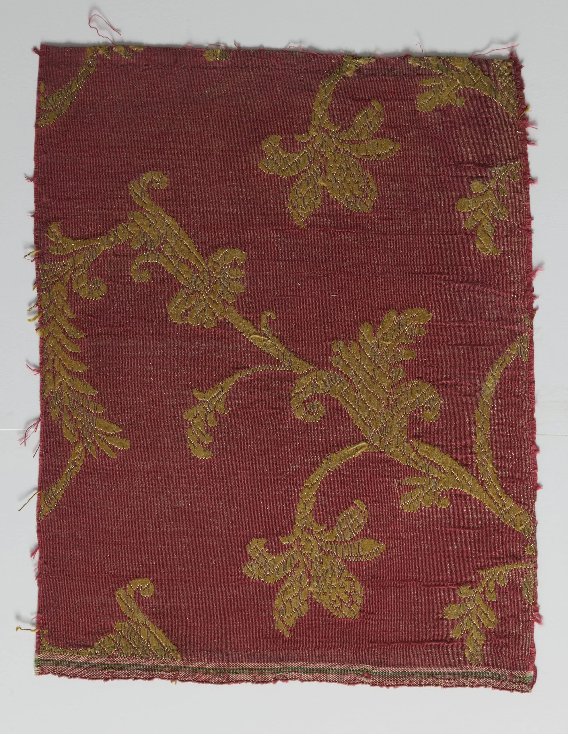 - Silk plain weave (faille) with metal-strip supplementary-weft patterning and metallic-thread discontinuous supplementary-weft patterning (brocade)