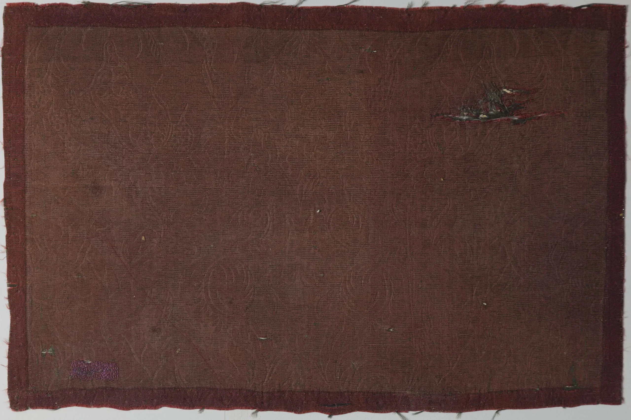 Horizontal textile panel with a deep brownish-burgundy damask-patterned central field, framed by a darker crimson-brown border, with frayed edges and a small area of thread damage in the upper right