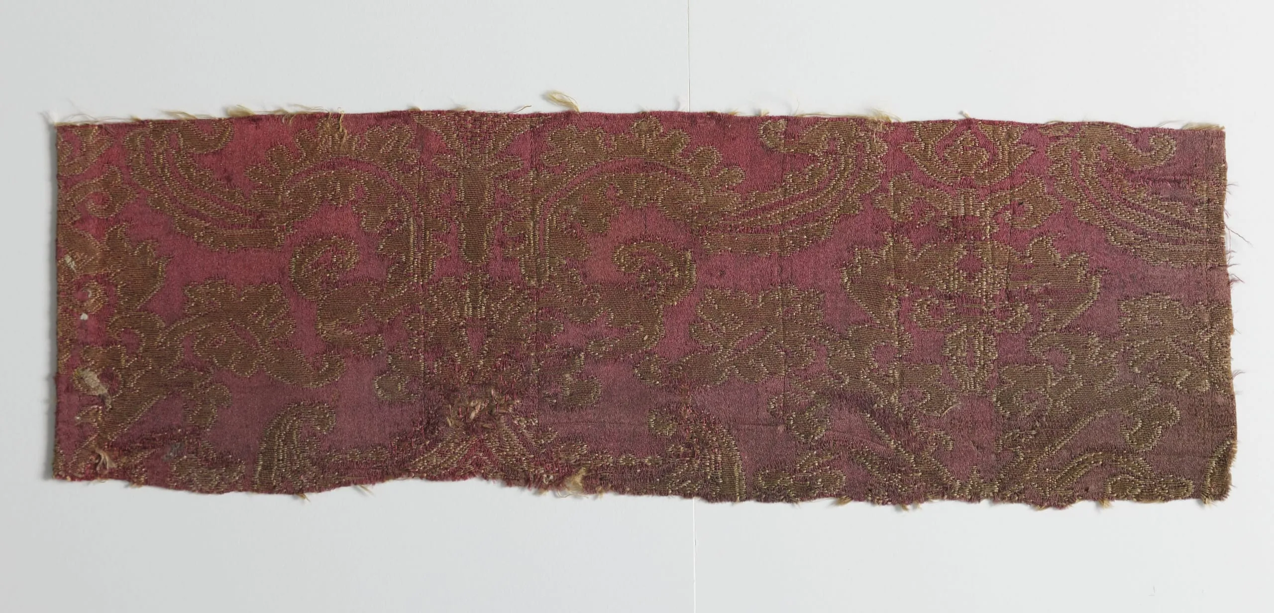 Rectangular textile fragment with crimson-red ground and allover pattern of large paisley and scroll motifs in tarnished gold metallic thread, with frayed edges