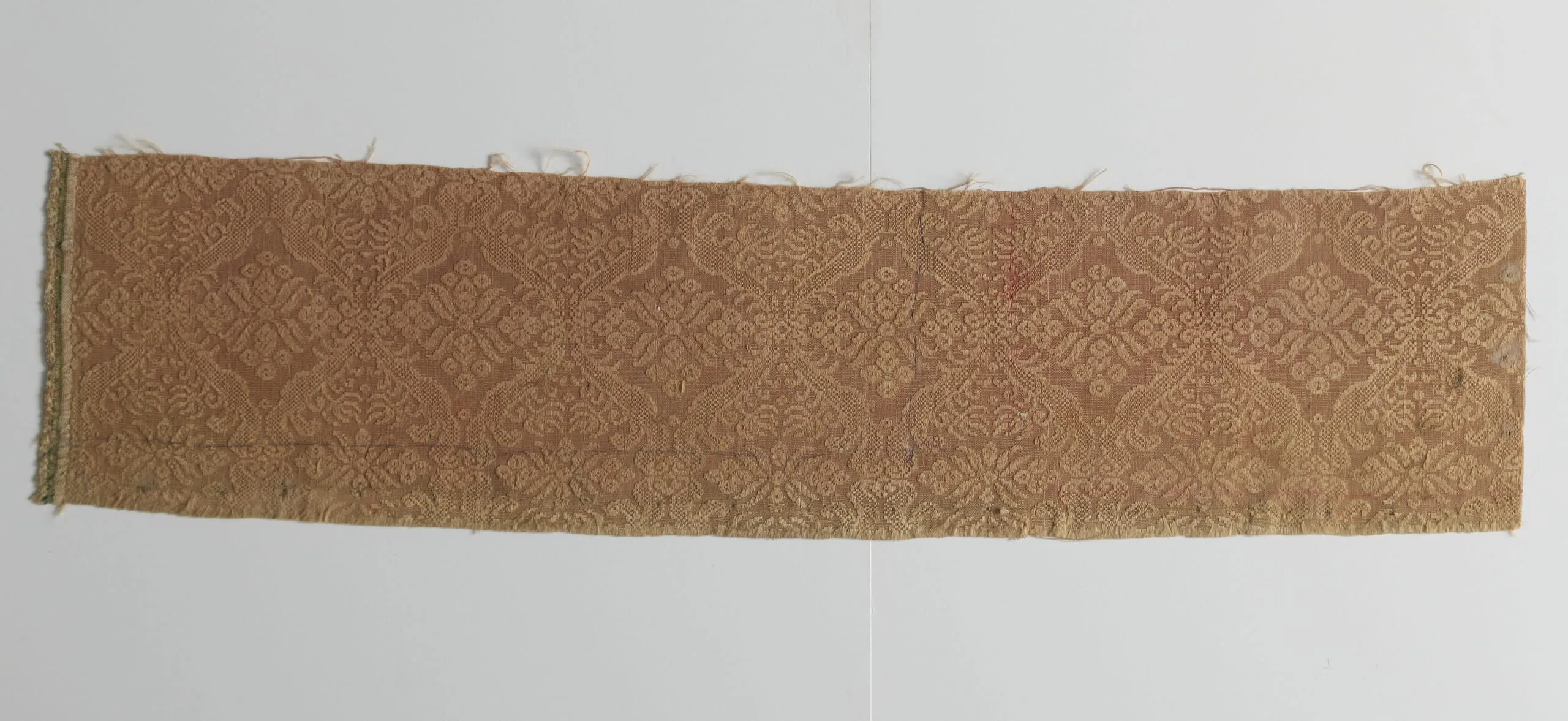 Horizontal woven textile fragment in warm brown tones with an allover repeating diamond medallion and foliate pattern, raw fraying edges