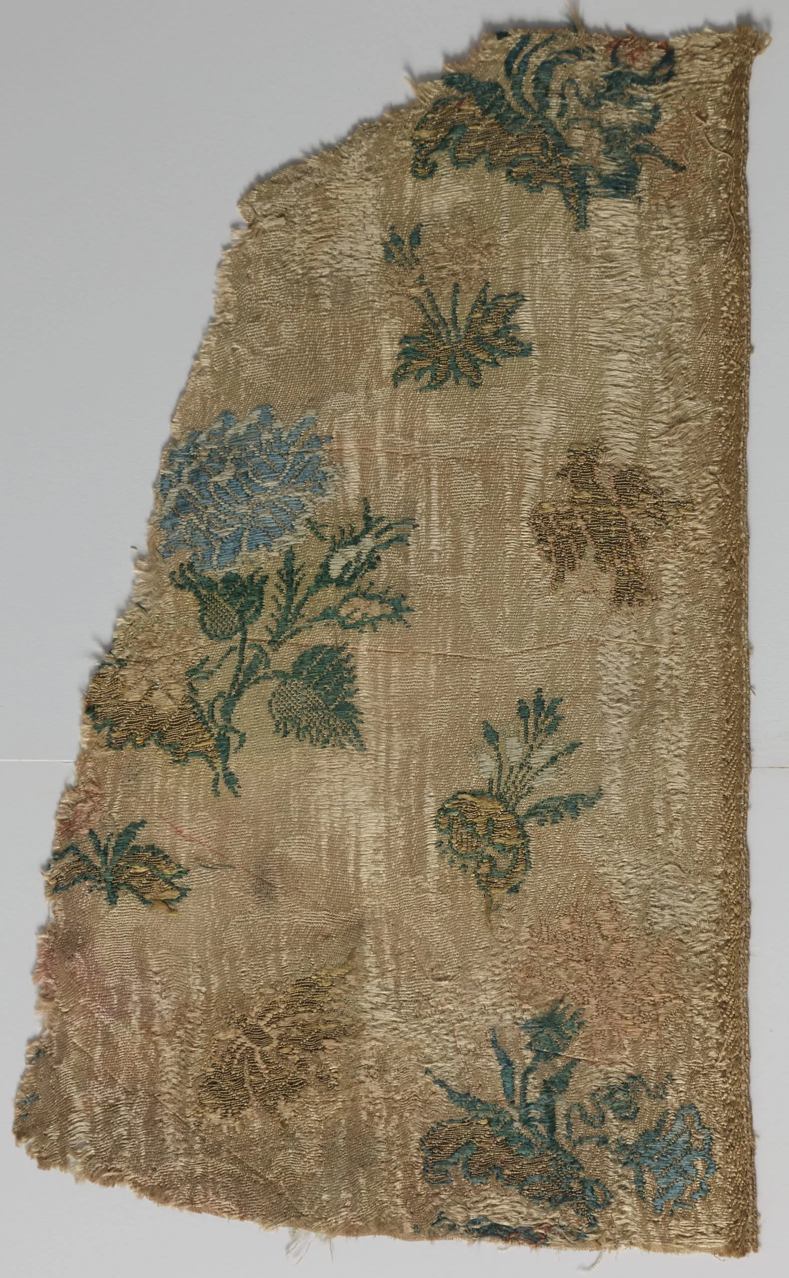 - Silk plain weave with silk warp and weft patterning and silk and metallic-thread discontinuous supplementary-weft patterning (brocade)