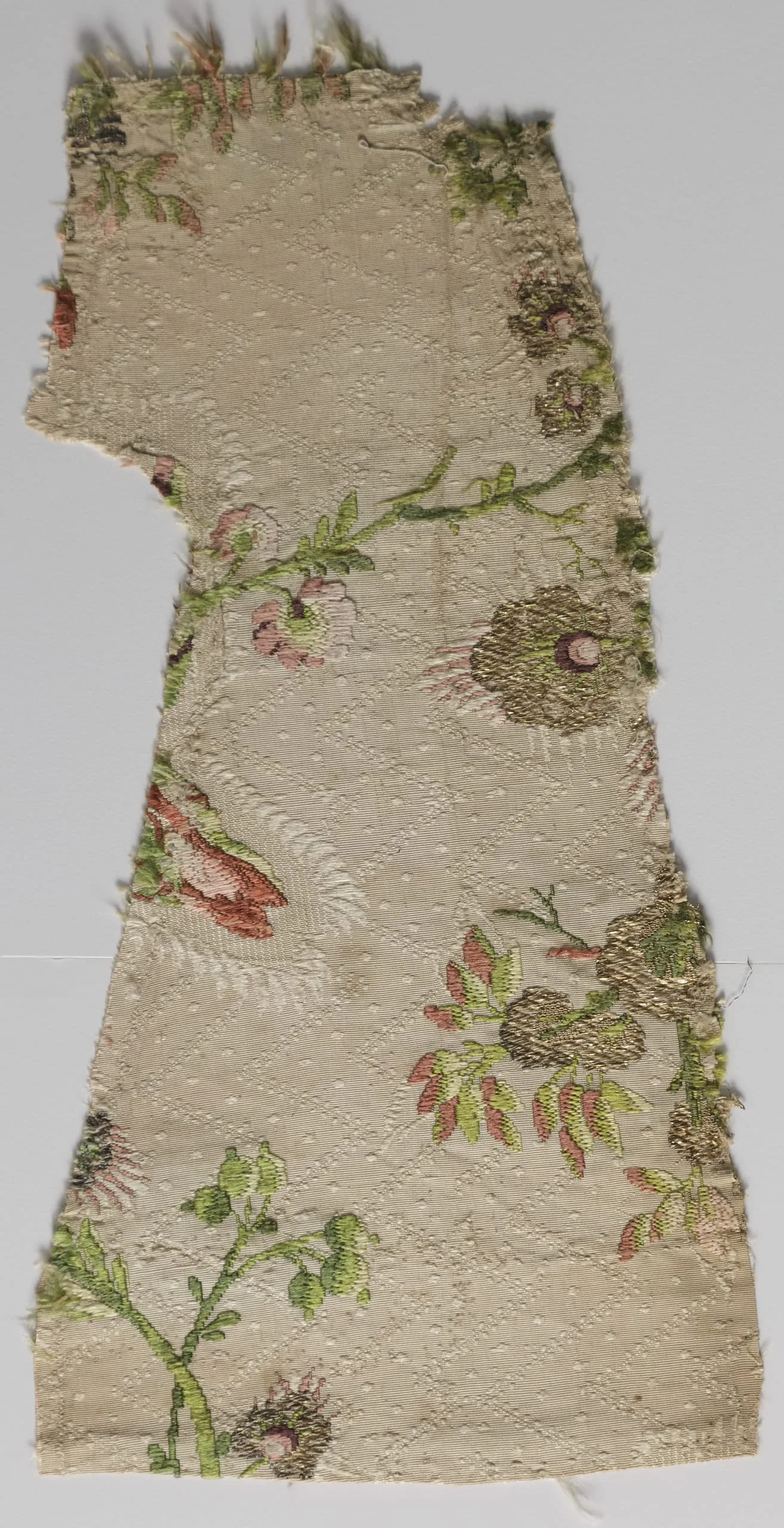 - Silk plain weave with silk weft patterning and silk, metallic-thread, and metal-strip supplementary-weft patterning