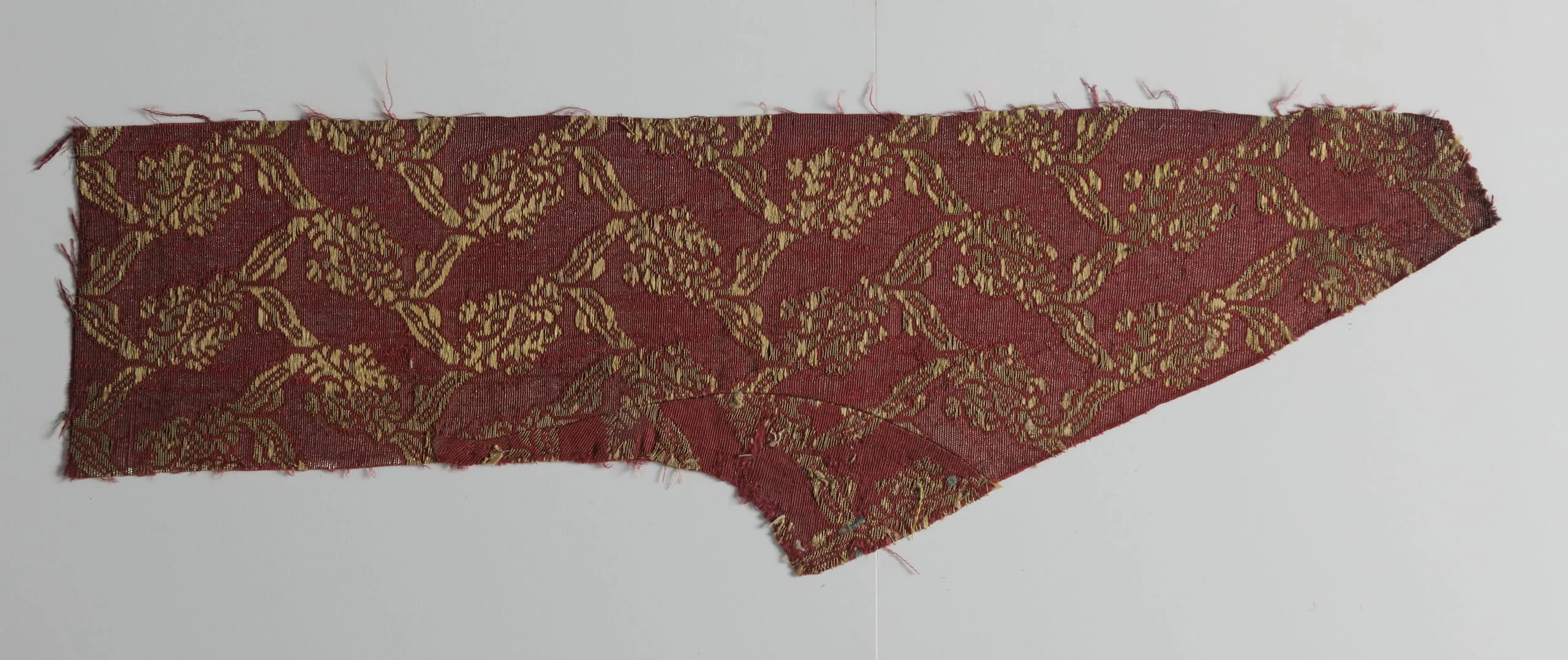- Silk plain weave (faille) with metal-strip supplementary-weft patterning and metallic-thread discontinuous supplementary-weft patterning (brocade)