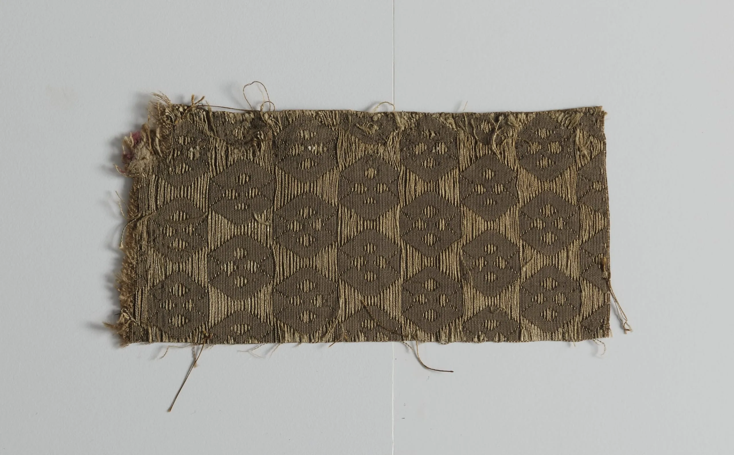 Horizontal woven textile fragment in tan and dark brown, with an allover repeating pattern of interlocking ogee medallions; edges are frayed with loose threads