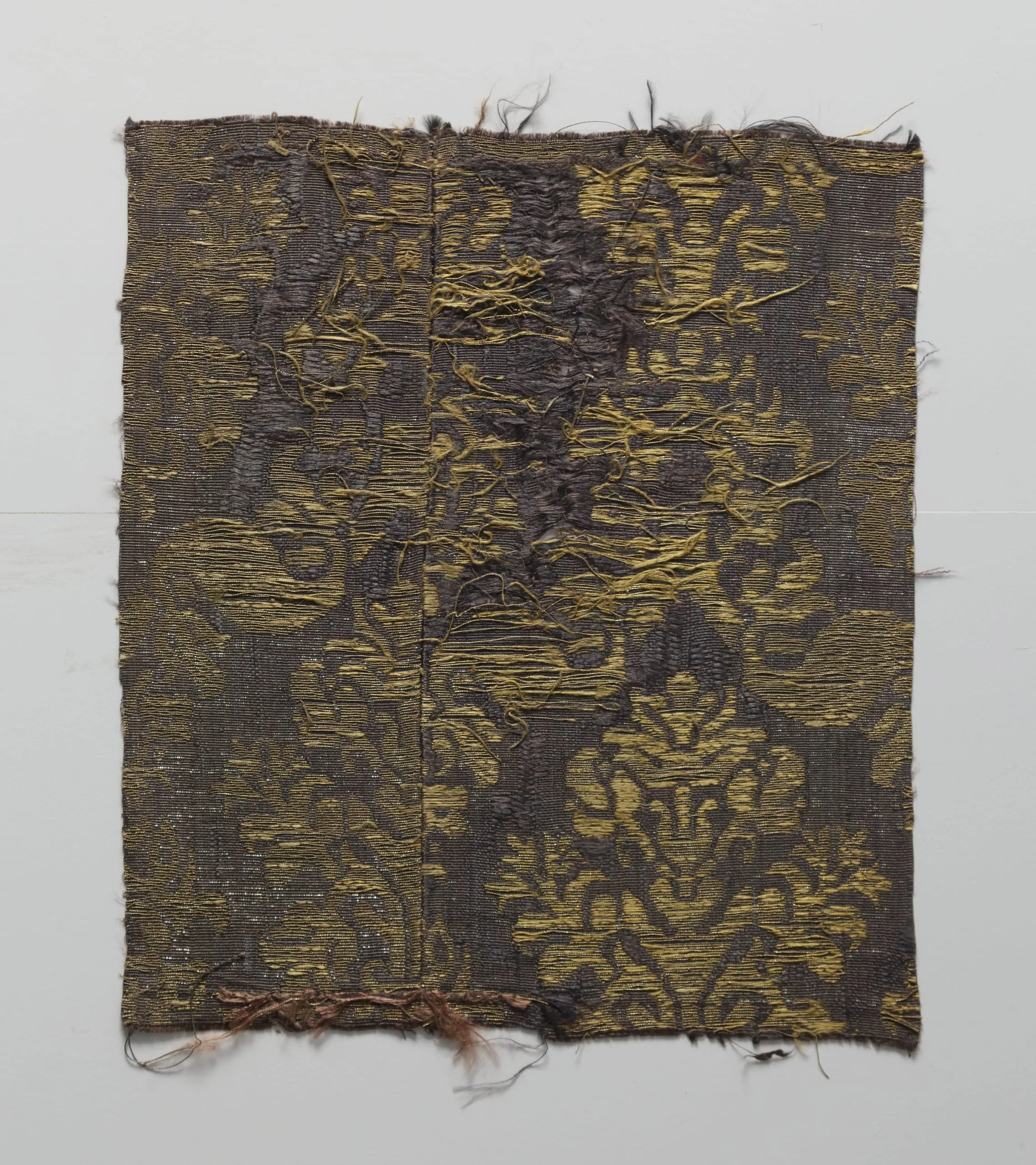 - Silk plain weave (faille) with metal-strip supplementary-weft patterning and metallic-thread discontinuous supplementary-weft patterning (brocade)
