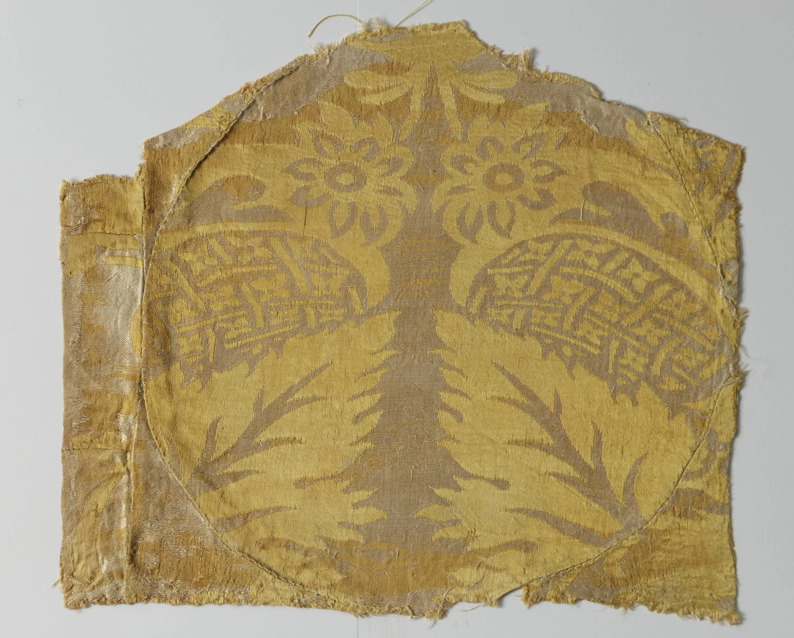 Textile fragment woven in golden yellow and tan, with a symmetrical pattern of two confronted birds within an ogival medallion, flanked by flowering plants with radiating petals