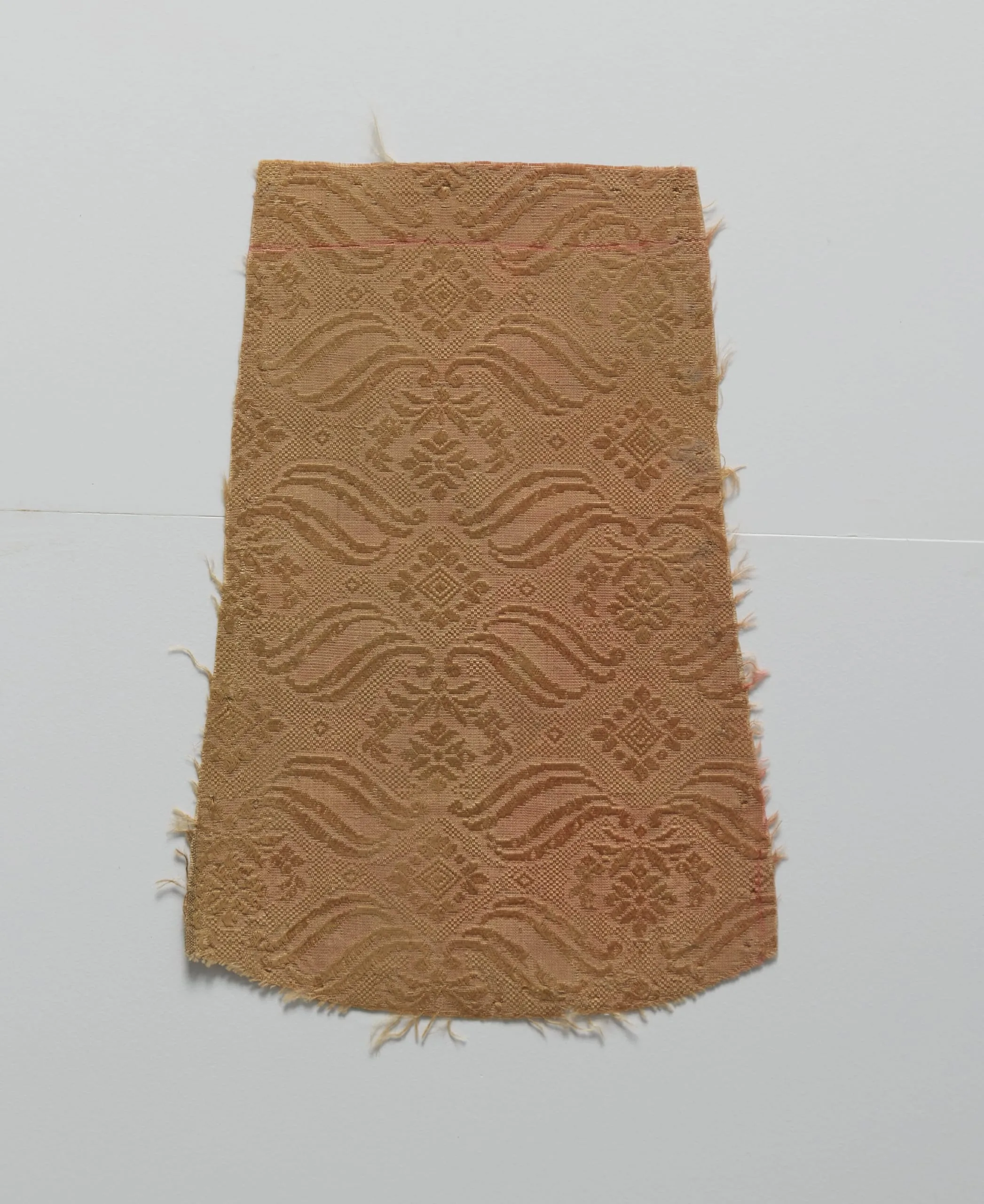 Woven textile fragment in warm tan damask with an allover repeating pattern of interlocking S-scrolls, snowflake medallions, and diamond motifs; frayed edges on all sides