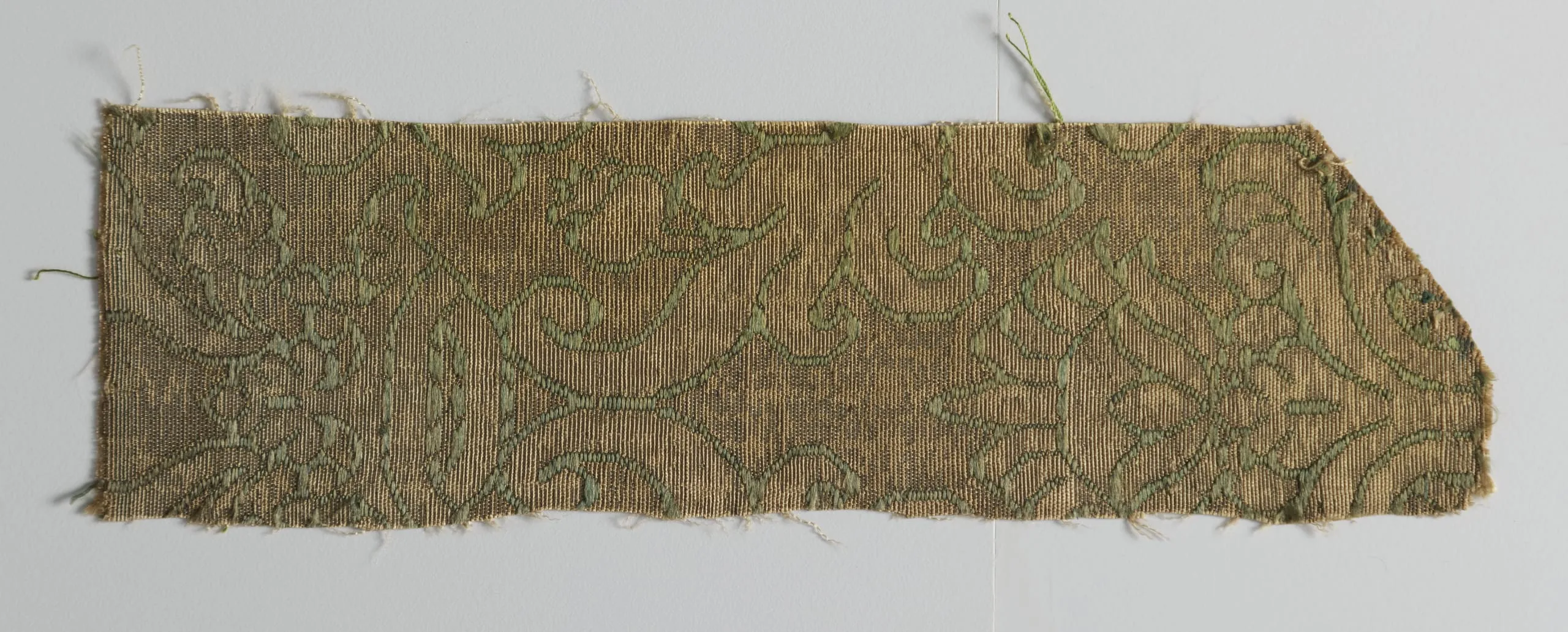 Horizontal textile fragment with tan ribbed ground woven with an allover scrolling vine and leaf pattern in sage green, frayed along all edges