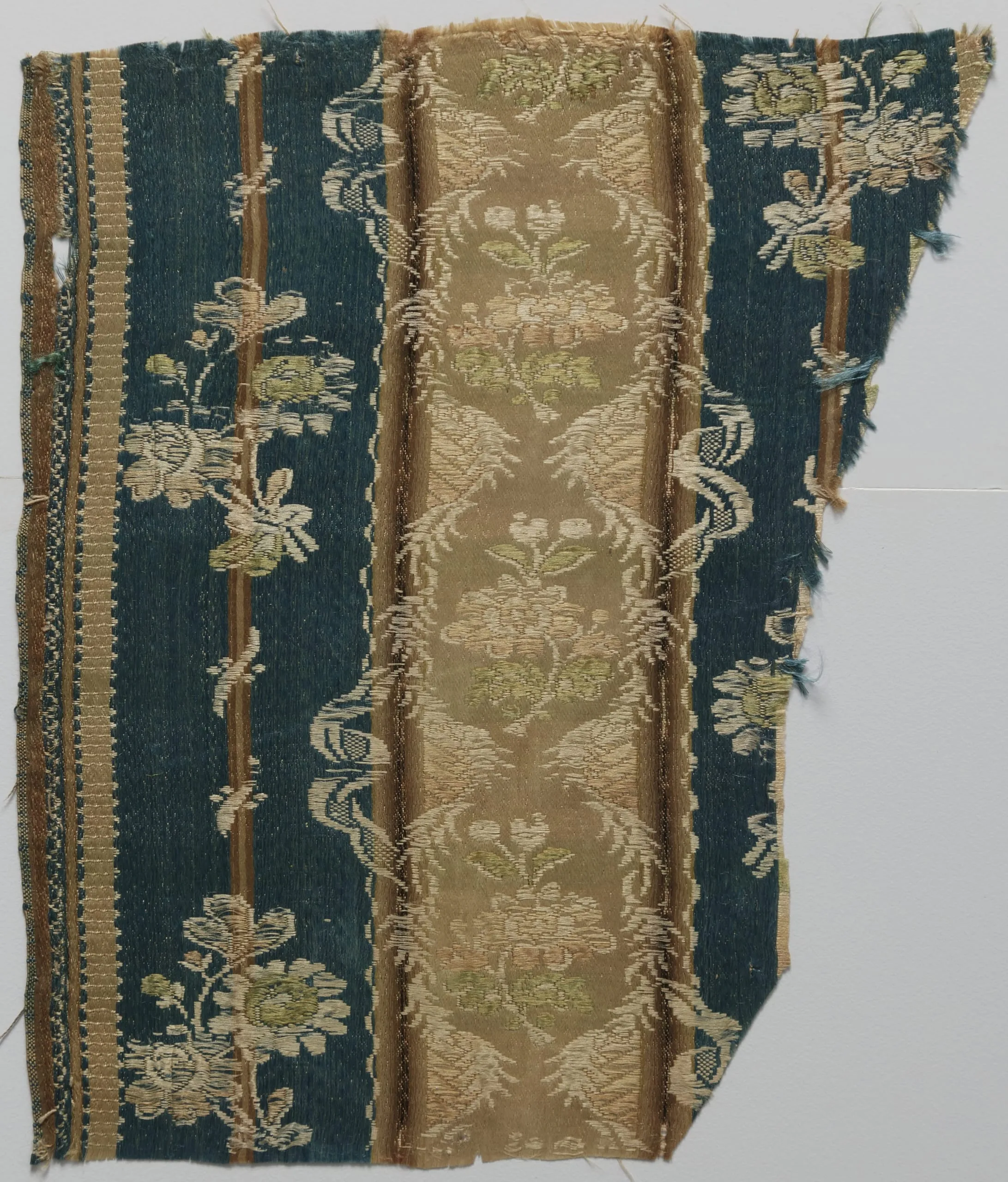 Woven silk textile fragment with vertical stripes in teal blue and tan, decorated with repeating cream and gold floral motifs; edges frayed