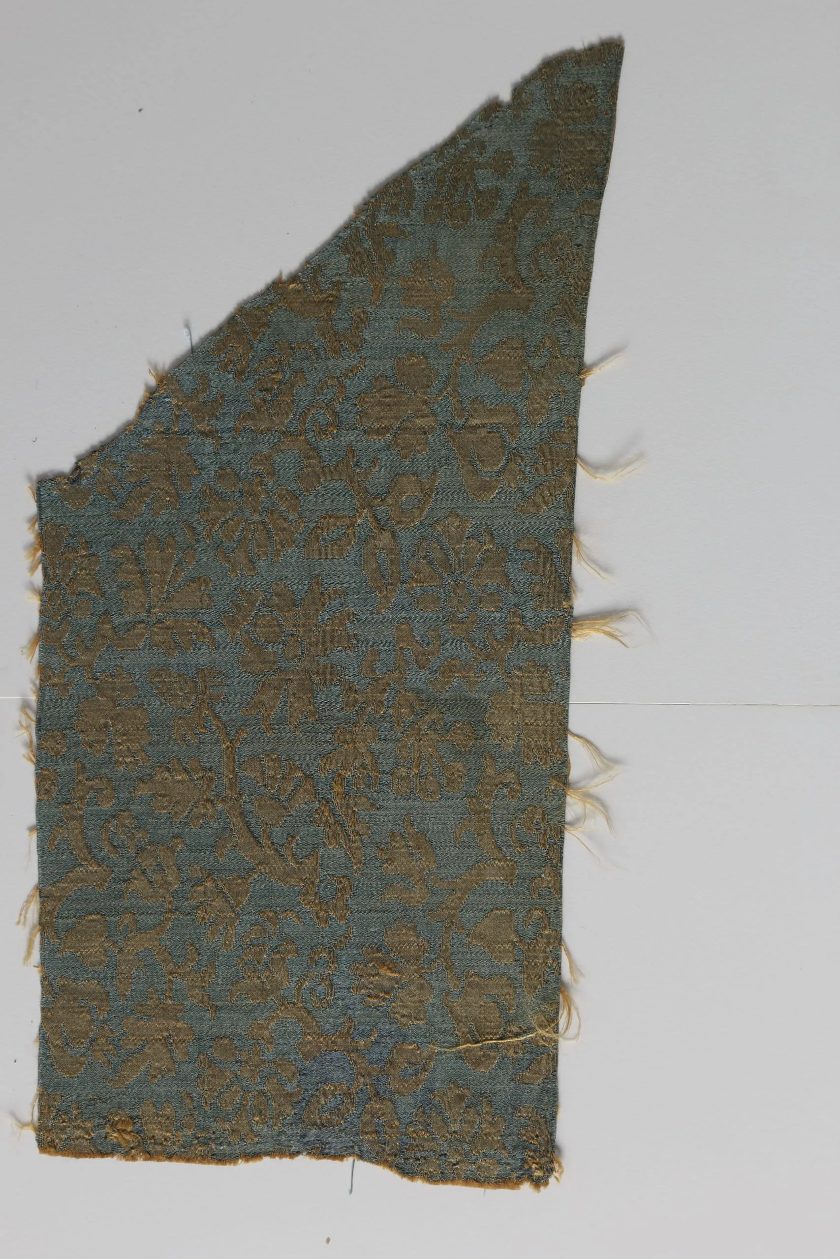 Textile fragment with frayed edges, woven in teal blue and golden tan threads in an allover interlocking ogival pattern with stylized floral motifs