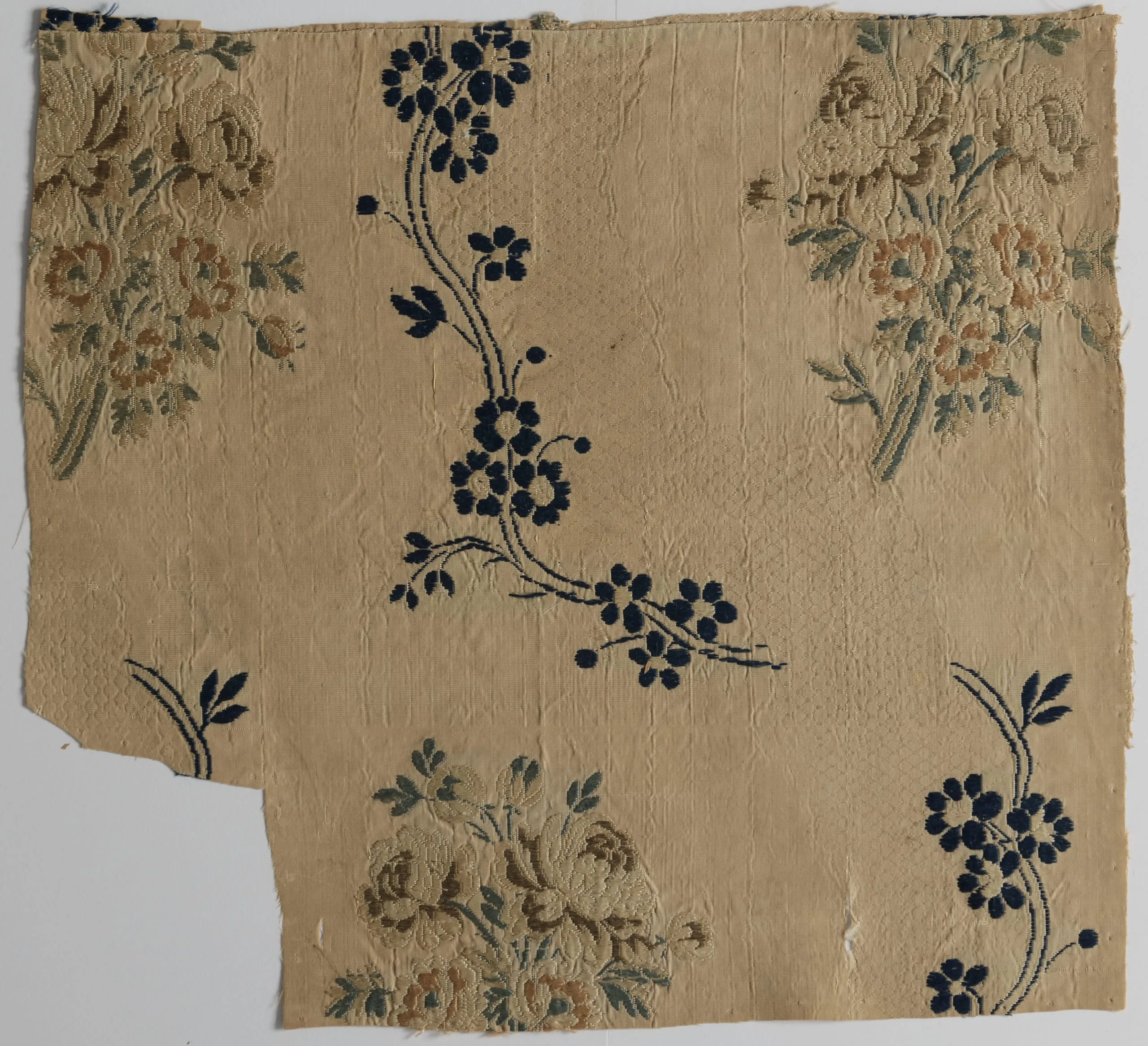 Woven silk textile fragment in cream with raised ivory floral bouquets and flat navy blue flowering sprays in alternating vertical columns; frayed and cut edges