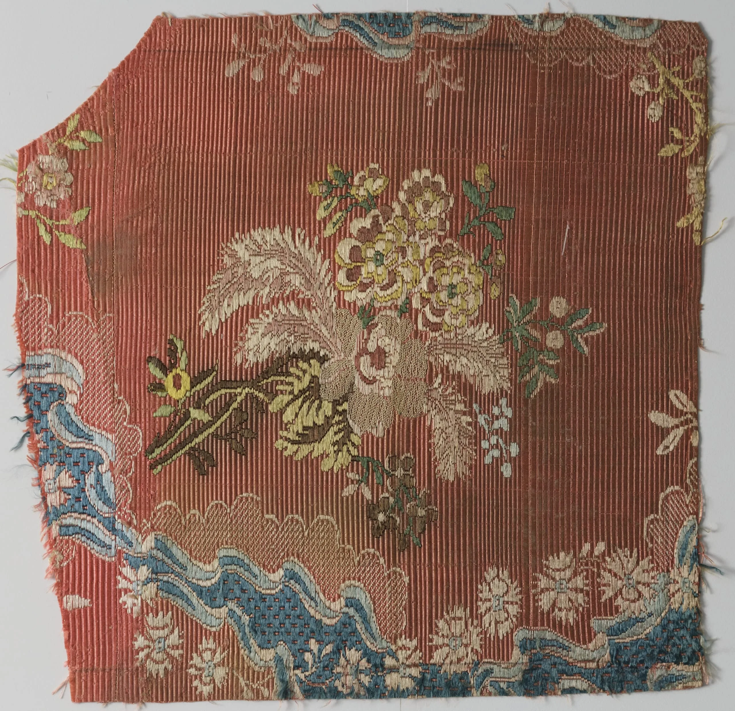 - Silk plain weave with silk warp patterning and silk discontinous supplementary-weft patterning (brocade)