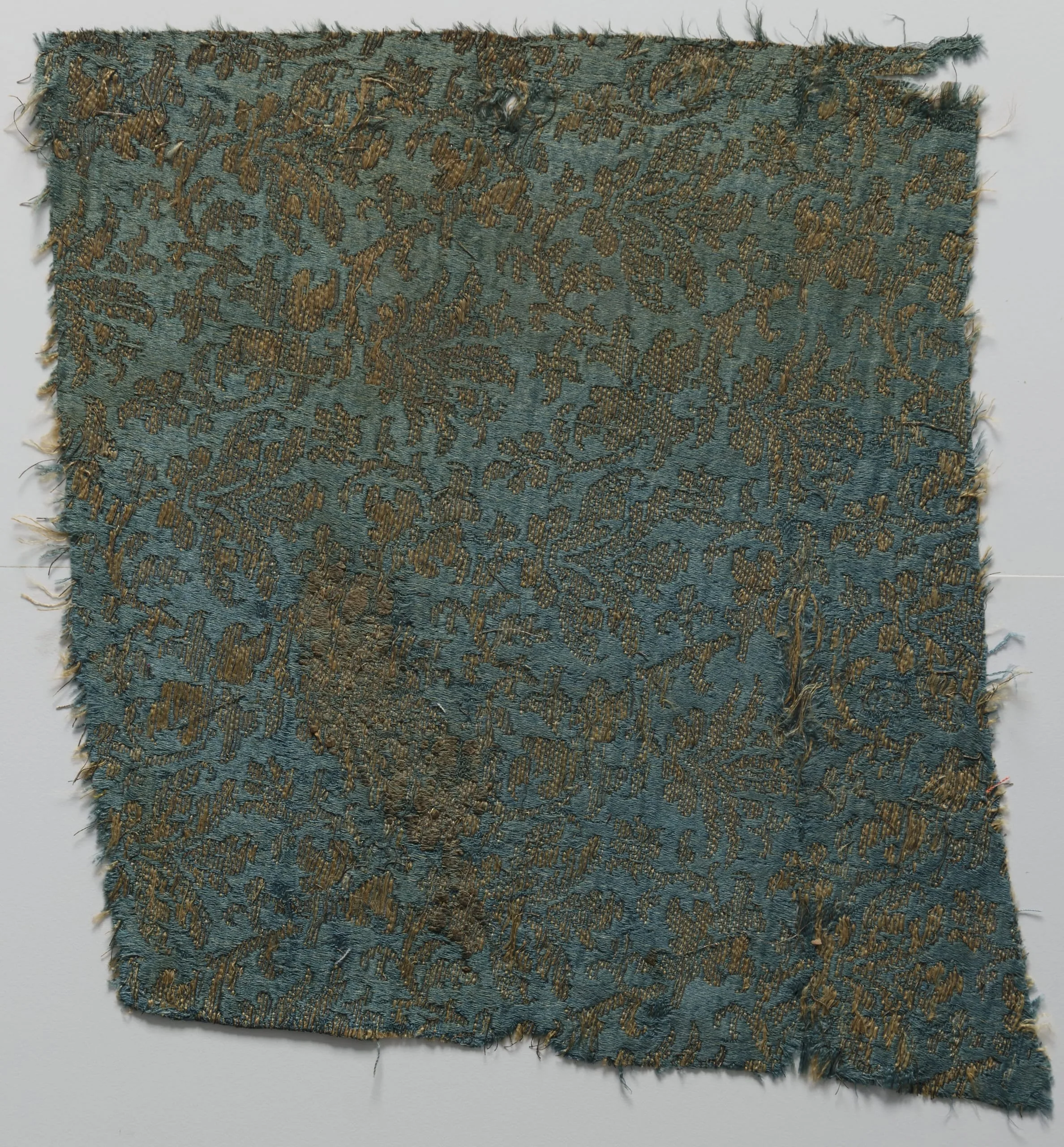 Textile fragment with frayed edges, teal-blue ground woven with an all-over bronze-gold foliate or leaf-scroll pattern