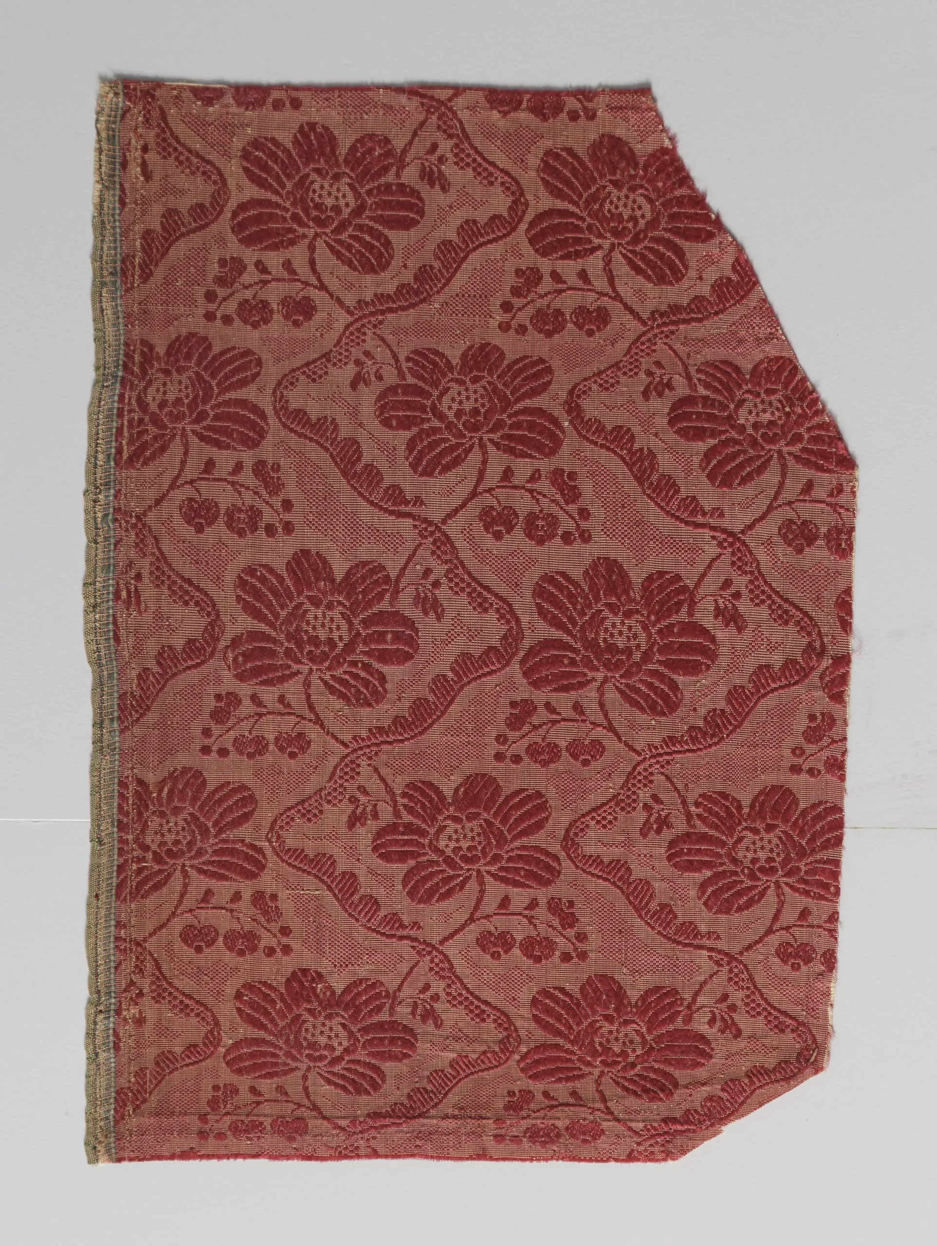 Woven silk textile fragment in rose-pink and deep crimson with an allover repeating pattern of large peony-like flowers and smaller buds arranged along serpentine bands