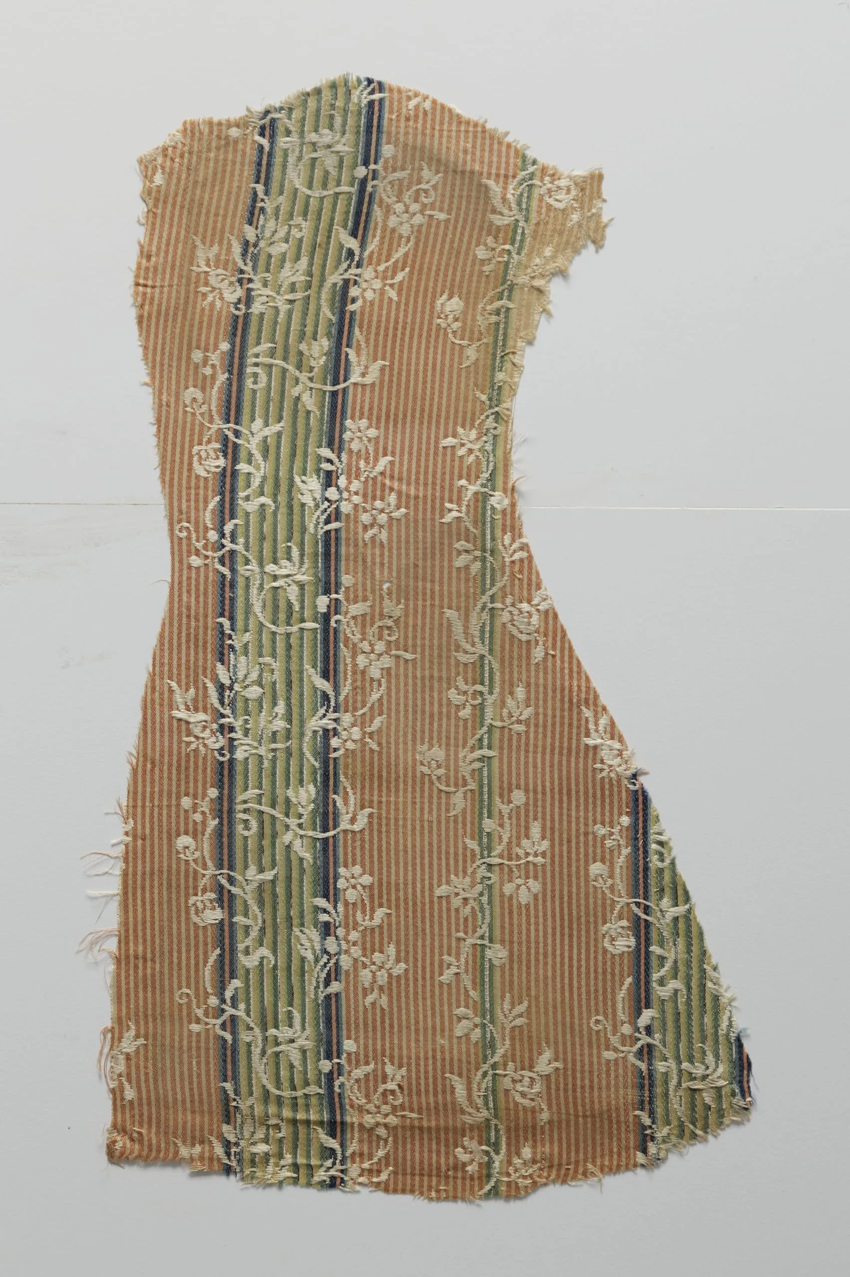 Woven textile fragment with vertical terracotta and ivory stripes, two decorative bands of navy and green stripes flanked by cream floral vine motifs, frayed edges