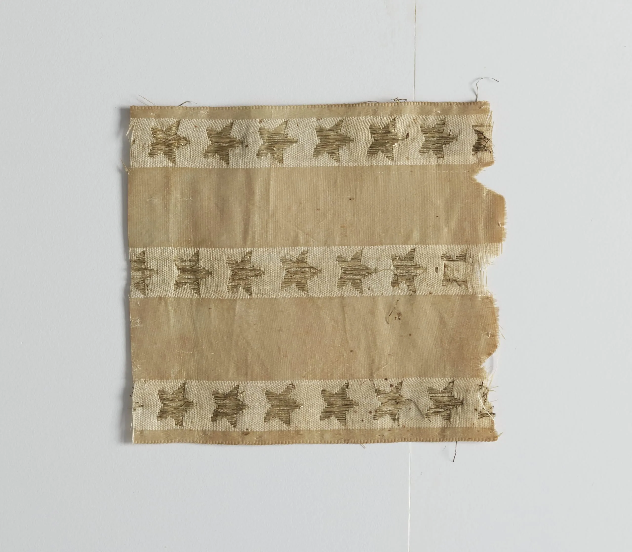 Aged textile fragment with alternating horizontal bands of plain tan fabric and cream-colored strips printed with rows of six-pointed stars in brown-tan, with frayed edges