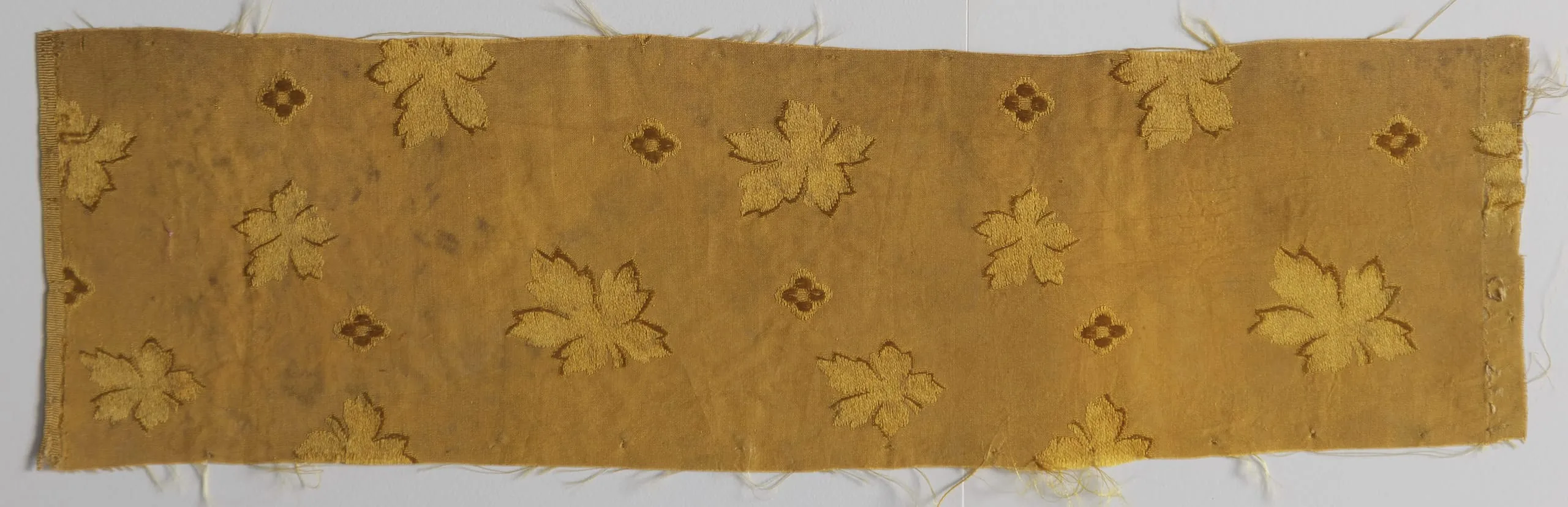 Horizontal silk textile fragment with allover scatter pattern of stylized lobed leaves and small four-petaled flowers in amber gold on a warm golden ground