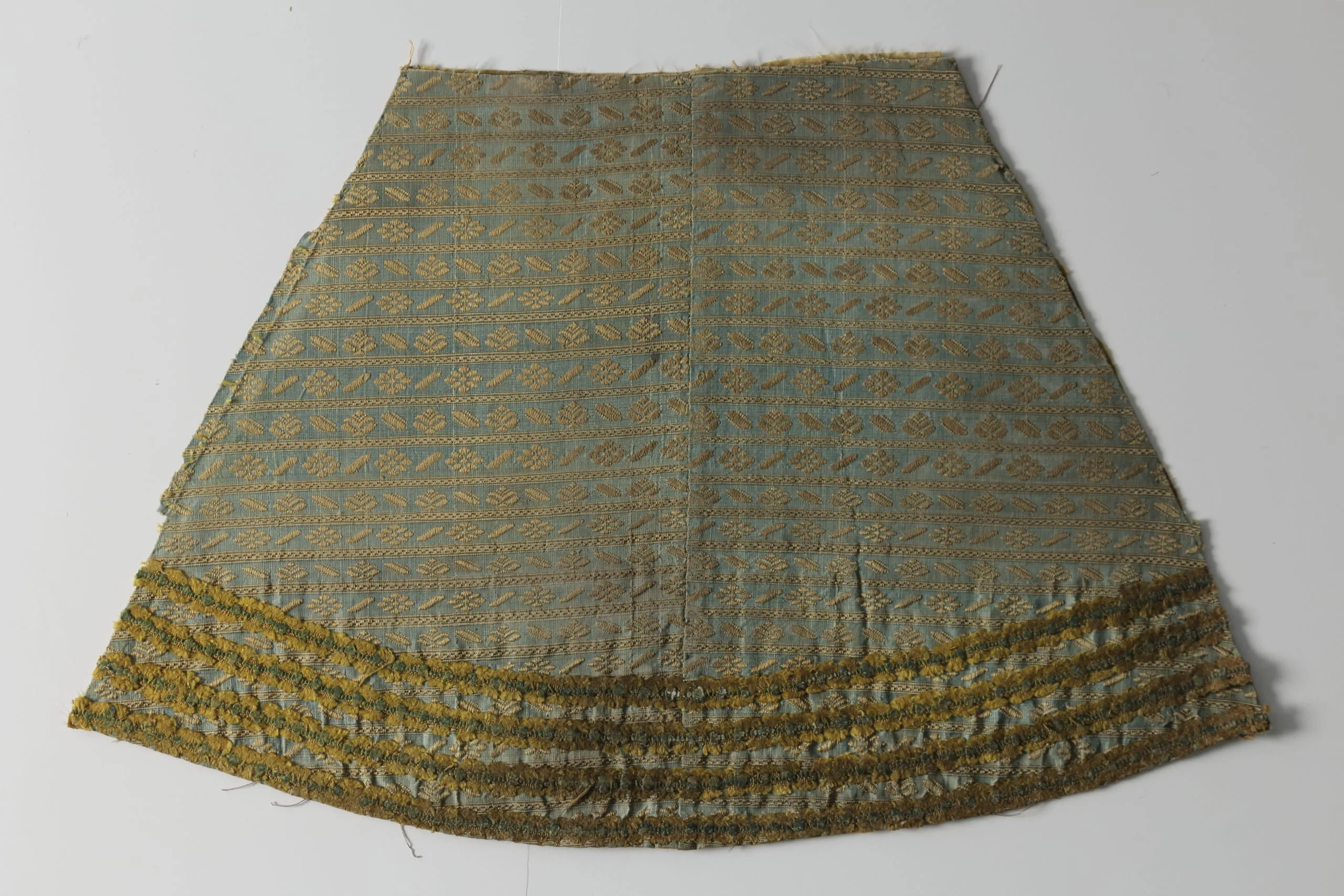 Trapezoidal textile fragment in steel-blue with allover gold brocade pattern, lower edge finished with layered pleated bands and olive-gold metallic trim