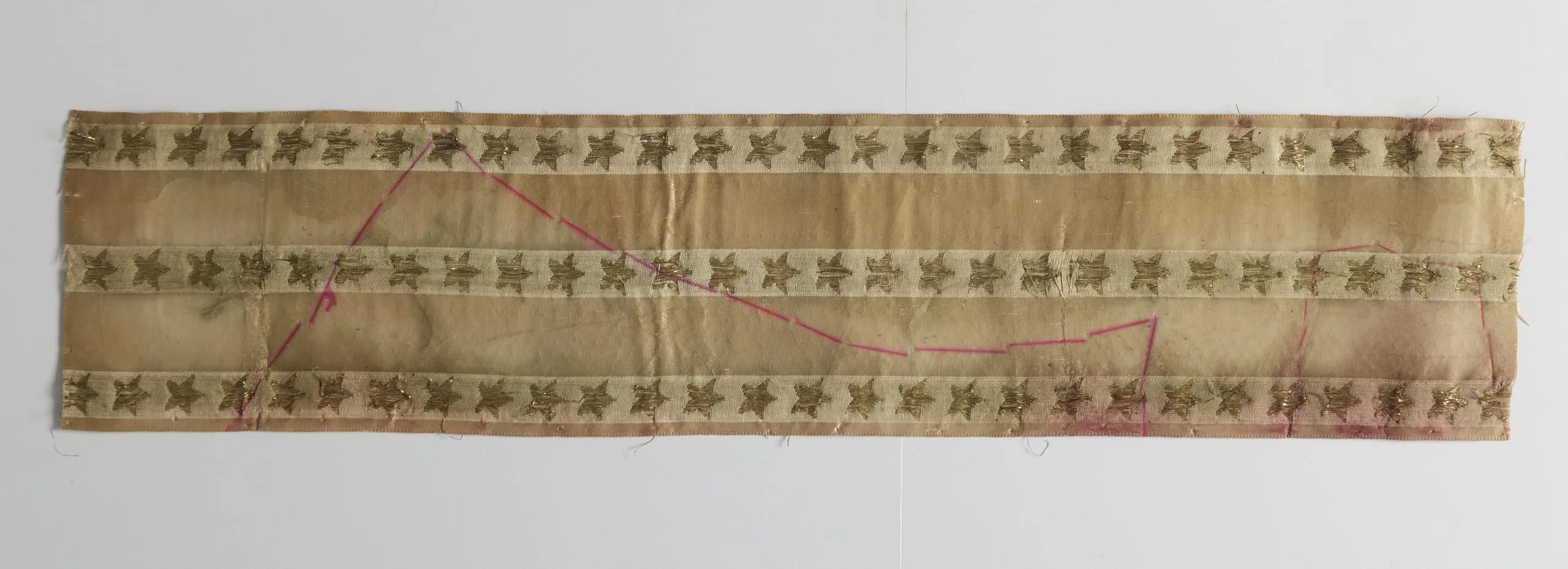 Horizontal woven textile fragment in golden tan with three rows of small olive and gold leaf or star motifs, marked with loose zigzag basting stitches in bright pink thread